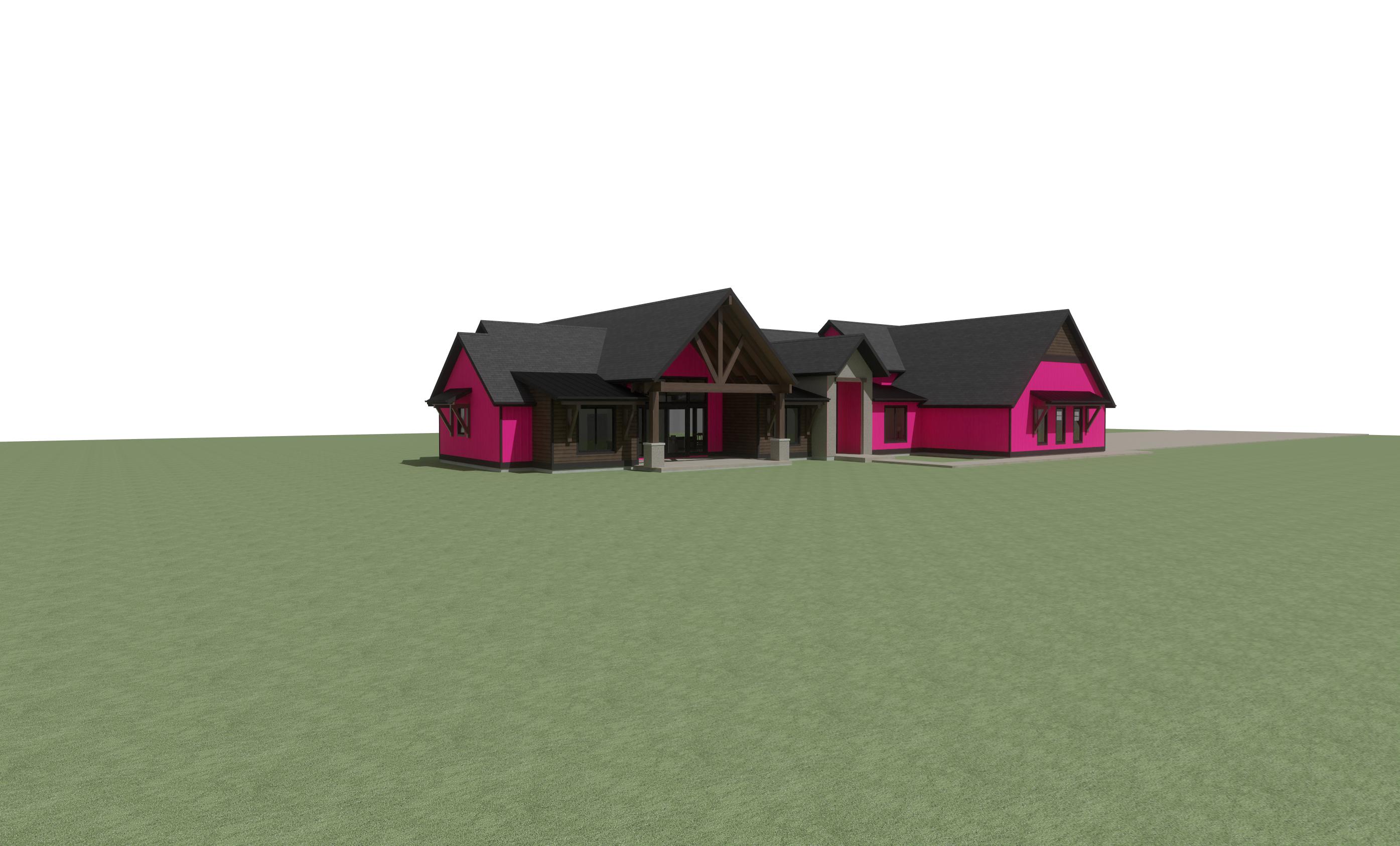 enhance the realism of the existing architectural design while maintaining the same materials and textures focus on realistic lighting shadows and surface details to create a lifelike appearance ensure the mixture of wood siding rock and board and batten is preserved in the correct areas making them look authentic and cohesive so keep the rock horizontal siding and vertical siding the same as reference photo but change texture and color this is in montana add montana landscape but nice landscaping near the house add montana vegetation around house make horizontal siding elkhorn by diamond kote make all trim around doors and windows trim at bottom of house and fascia diamond kote onyx color make pink board and batten diamond kote denali make all wood stain sherwin williams charwood make rock like a stacked mountain modern style rock make nice landscaping in foreground do not change the rocks on walls only do rock on the skinny tall entrance that i have shown do not add chimney make sure the horizontal color is elkhorn by diamond kote siding products