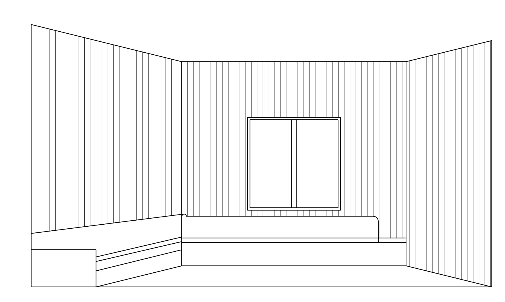modern built in sofa end table on right side large format grey tile floor white slatted walls architecture