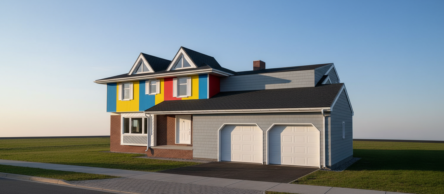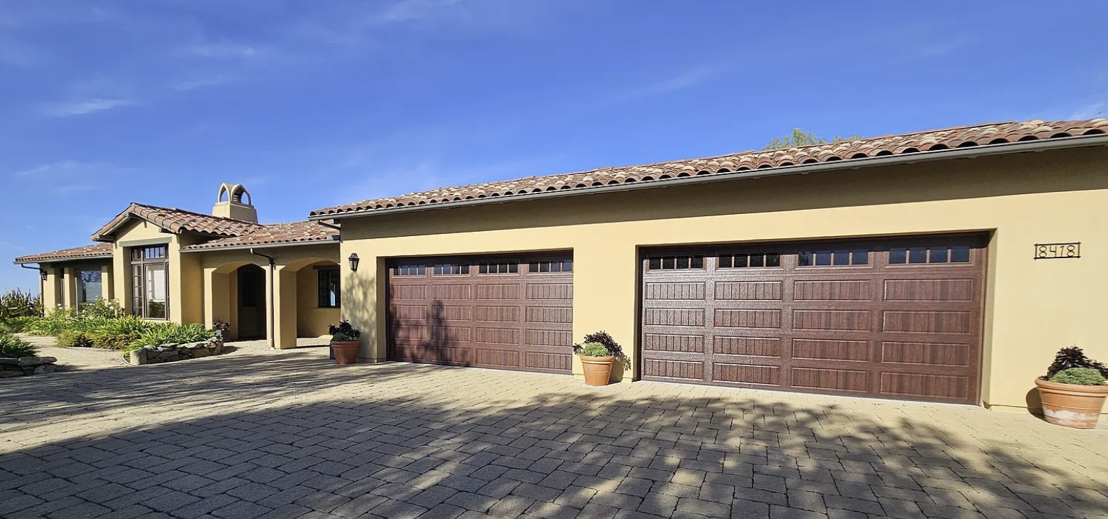 create photo realistic rendering to this california modern estate keep architectural design the same keep tile roof add overgrouted rustic white limestone to garage surround change stucco color to off white with black window trim and espresso stained garage add olive tres and aloe landscaping change driveway to cobblestone change sconces to larger more rectangular and glass fixtures add sconce between 2 garages
