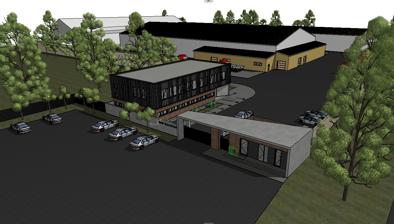 create a photorealistic architectural visualization in 4k resolution use concrete dark metal and brown brick materials render with a bright sky and natural lighting glass windows feature realistic reflections add leafy trees to the background
