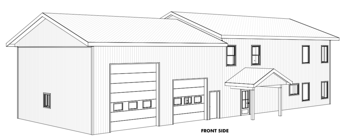 create a beautiful and serene rendering of a two story farmhouse with a garage the house features a gabled roof with dormer windows and a front porch use warm bright white steel siding tones for the siding and black steel roofs to create a welcoming atmosphere the roof should be a dark gray metal complementing the white trim around the windows and doors ensure the garage doors are a matching shade of beige with windows to add character add lush green landscaping with colorful flower beds and a clear blue sky to enhance the peaceful country ambiance