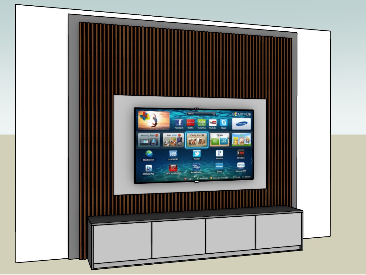 this is a drawing of a tv unit with acoustic panels and a cabinet it is built in layers from the wall first he outer frame then 20mm infront of that the acoustic panels and 70mm infront of them the tv frame and then the cabinet please render this unit in a sitting room worthy of a stylish interiors award