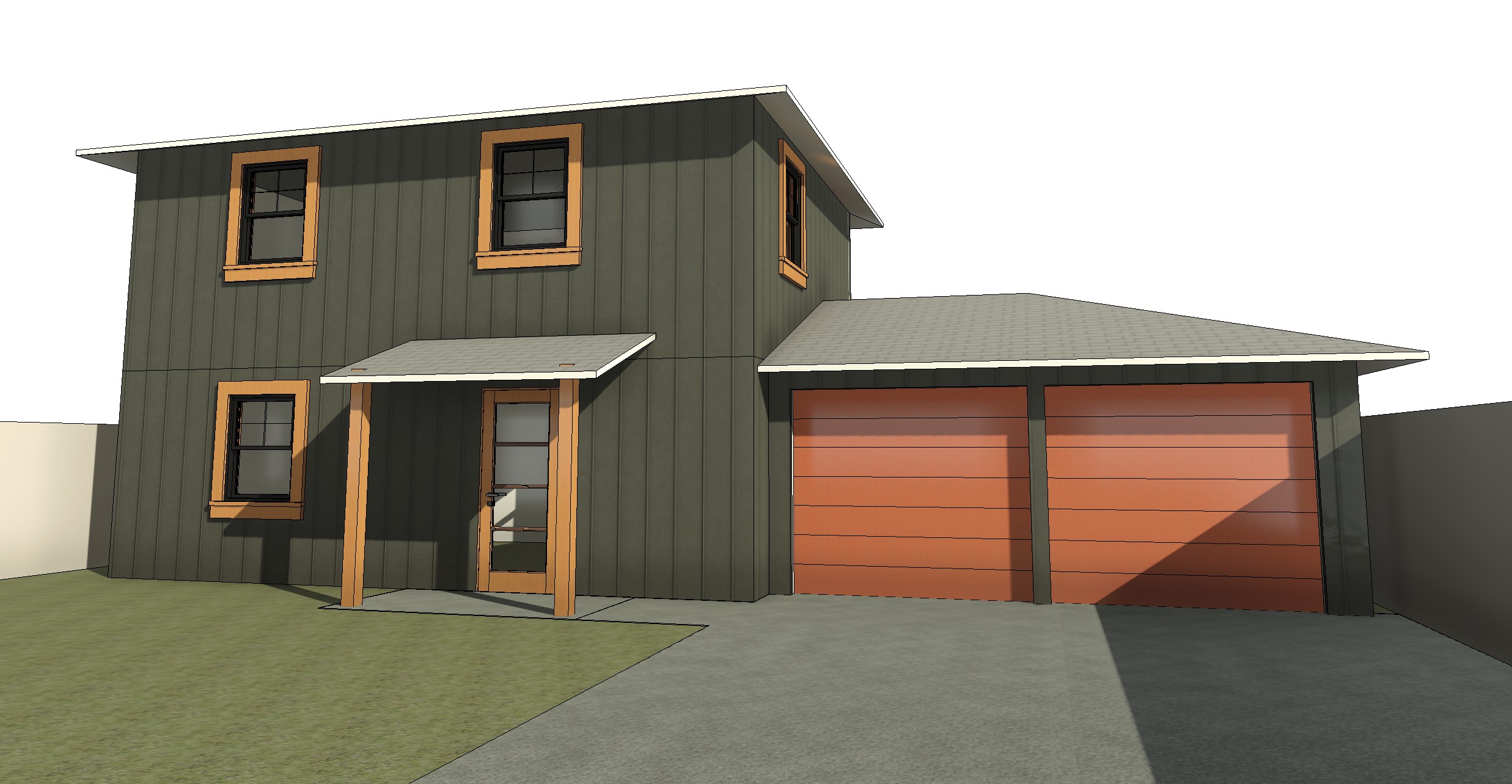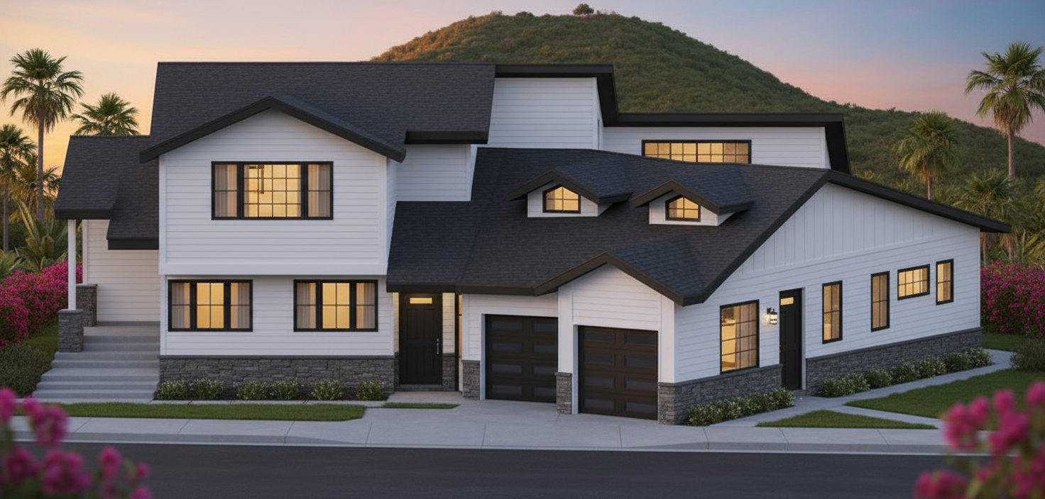 convert to a modern farmhouse style with black vertical board and batten walls and cedar wood window trims with california native landscape and trees in califonia sunny weather