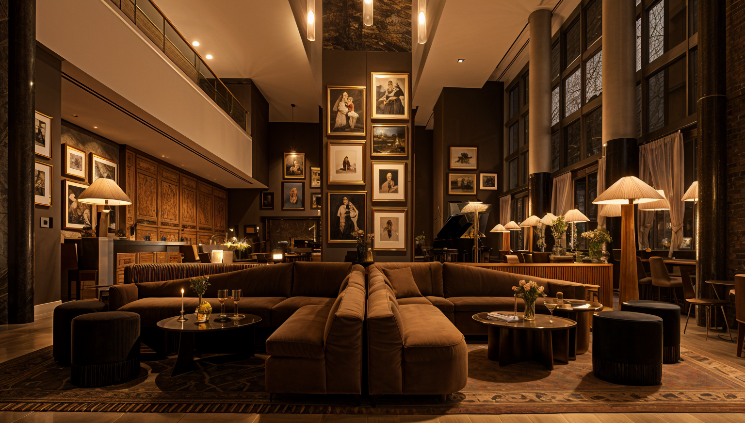 make this image dark and moody lighting should be an 1800 kelvin amber glow editorial and vogue there should be pools of warm light on each of the seating sections