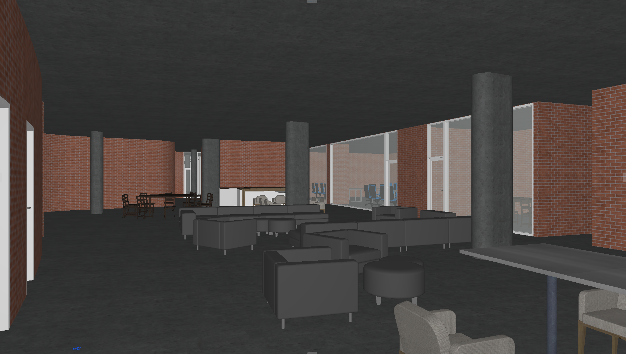 the space features a light grey terrazzo floor with a matte finish partially softened by warm beige area rugs in the seating zones a dark textured acoustic ceiling contrasted by a suspended linear slatted feature with integrated lighting curved and flat walls clad in light wood veneer panels combined with sections of vertical acoustic slats and smooth neutral plaster glass partitions with slim dark metal frames and soft lounge furniture in beige upholstery with black metal bases complemented by small round tables and warm toned pendant lights with glass shades