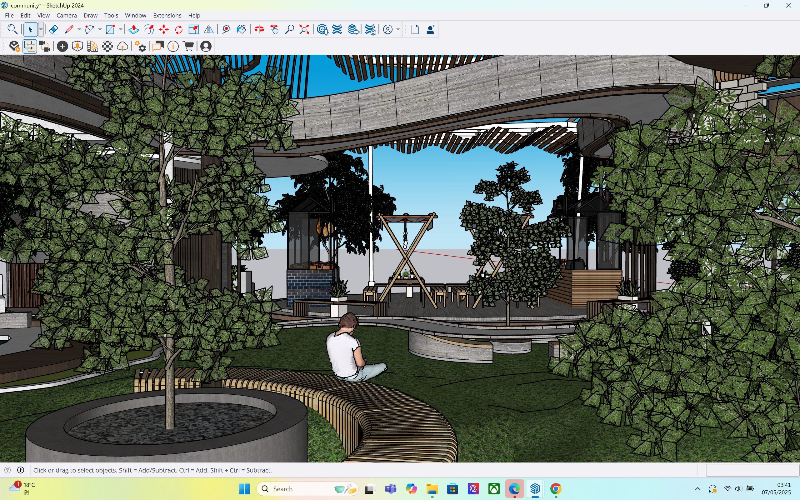 modern close up shot community center day time wood material grass outdoor open area more garden grass and sitting area flowy pathway food court behind architecture