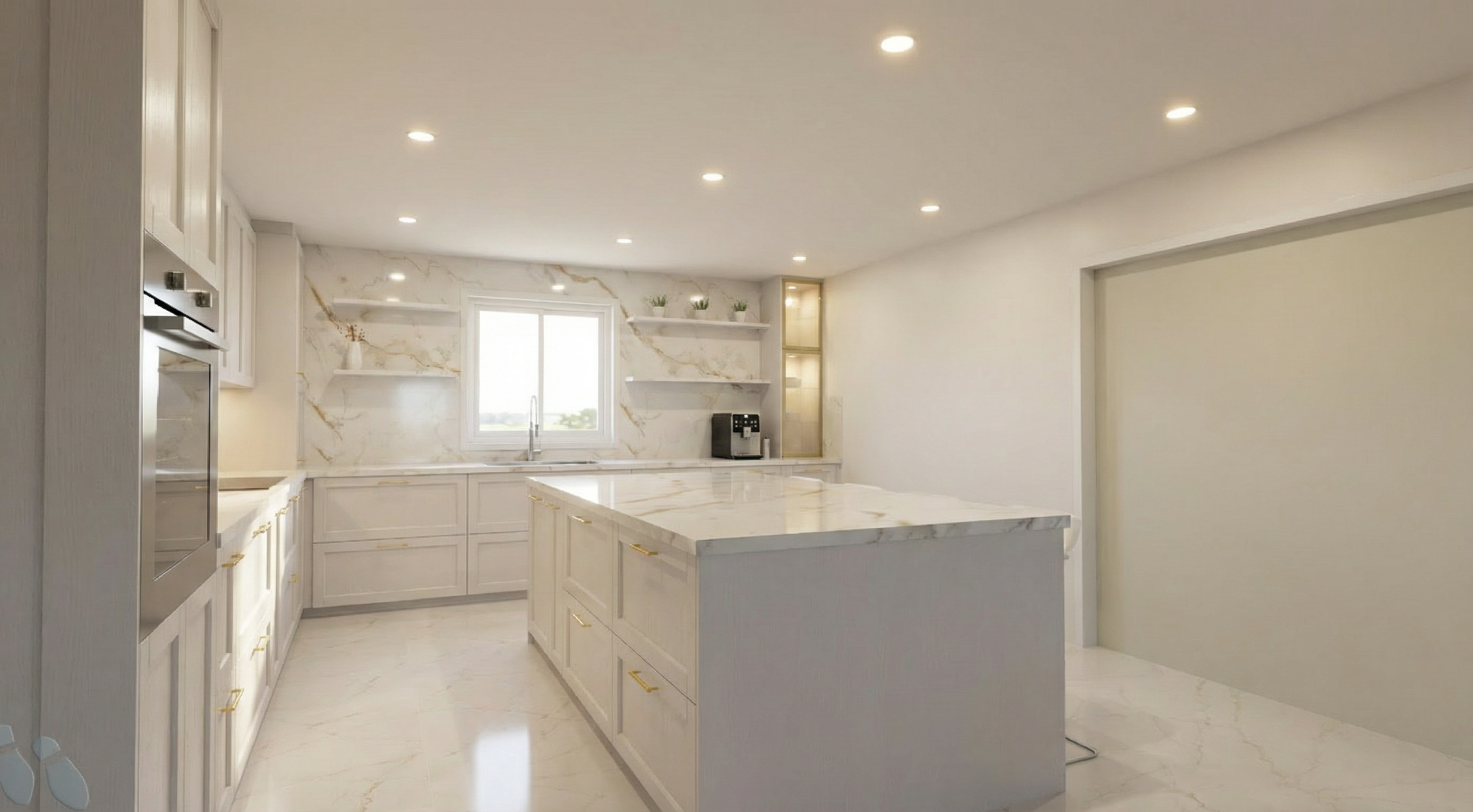 transform the provided interior image into a high end photorealistic render with soft glowing highlights and relaxed upscale energy while keeping everything exactly the same same proportions same seating same ceiling same wall finishes same materials and same spatial configuration do not move or alter any objects geometry textures colors or furniture positions all objects throughout must remain exactly in the same locations and proportions on the left windows only provide nyc building views from 44th floor in the middle of midtown new york city in the morning light do not change angle of the rendering keep the same