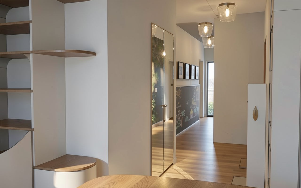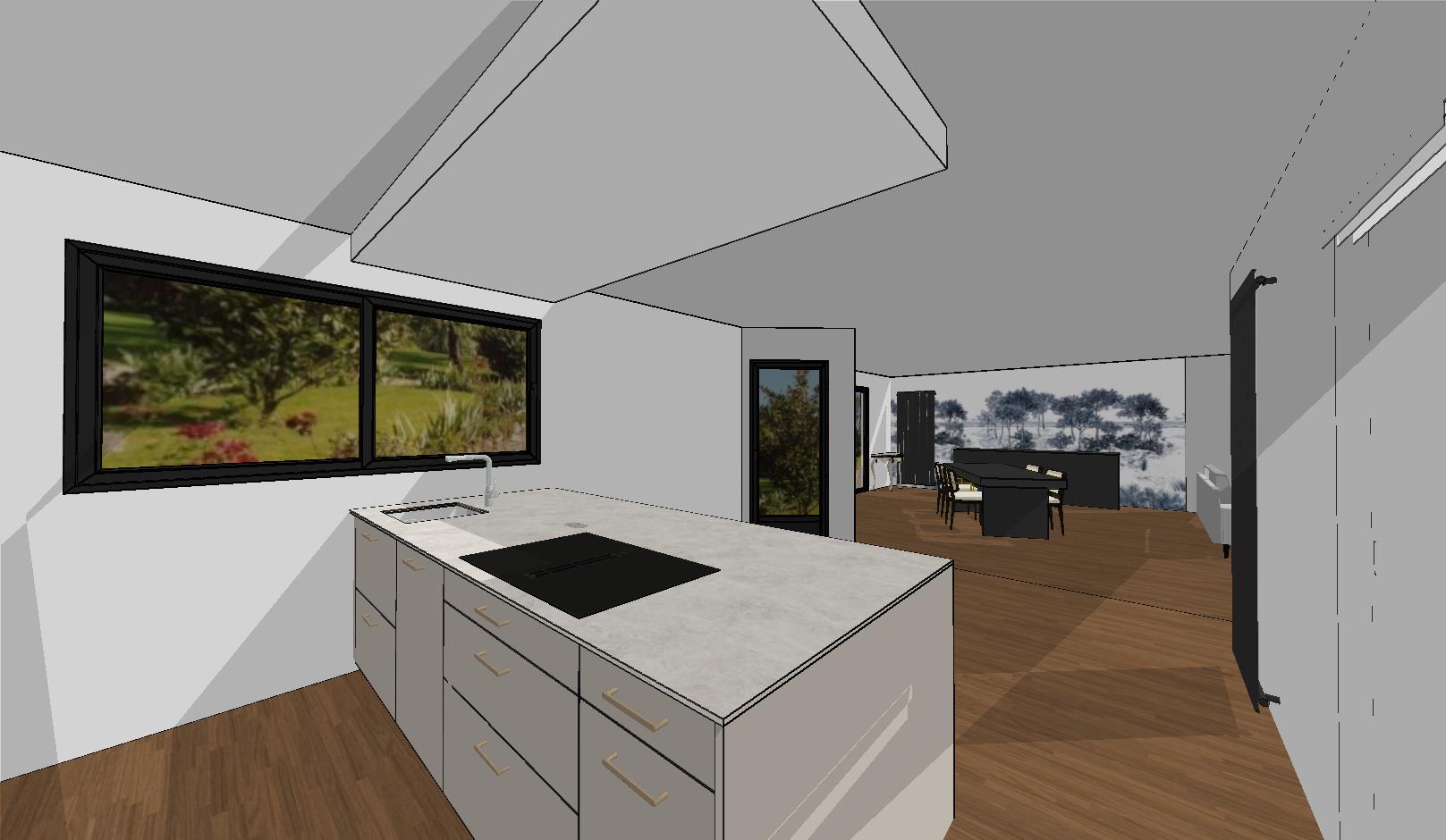 ajoute 3 suspensions tube noir au dessus de l ilot ajoute un tapis bleu fonc sous la table manger et une suspension au dessus