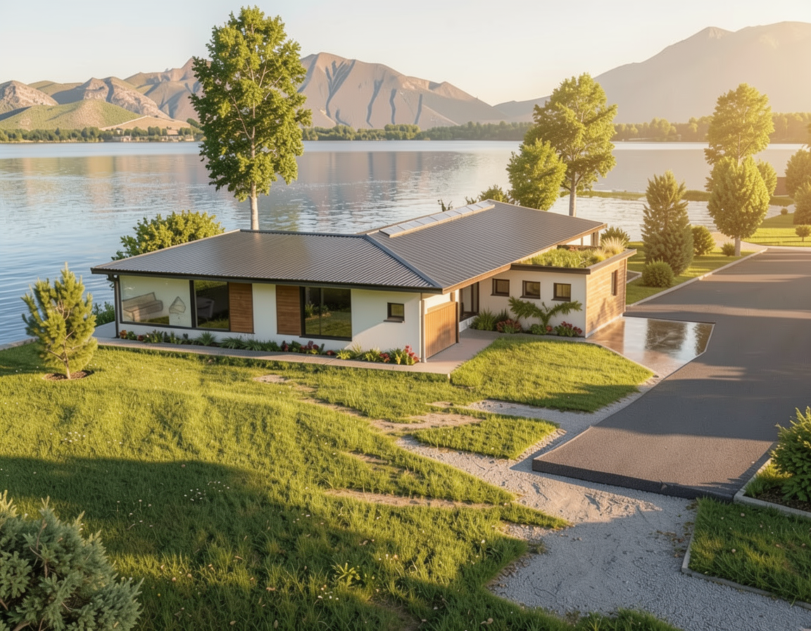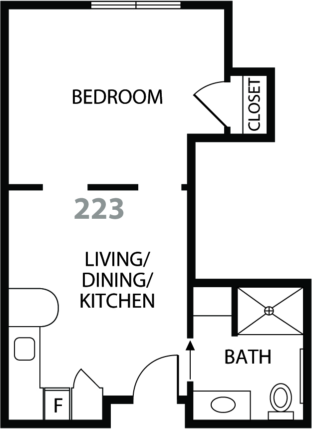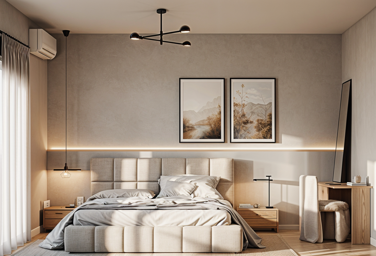 primary reference black and white floor plan this image defines the layout and must be followed exactly secondary reference furnished interior images these define only the style lighting and materials not the layout task create a realistic interior view of this apartment from eye level critical rules follow the floor plan exactly wall positions room connections proportions do not redesign expand or simplify the layout do not create a dollhouse cutaway or top down view keep the apartment compact and realistic in size style bright neutral daylight no yellow amber cast soft modern senior living style light wood tones warm neutrals soft textiles clean inviting not overly staged composition eye level camera 5 ft show depth between living space and bedroom natural believable furniture placement based on room size priority 1 layout accuracy floor plan 2 realistic proportions 3 style application