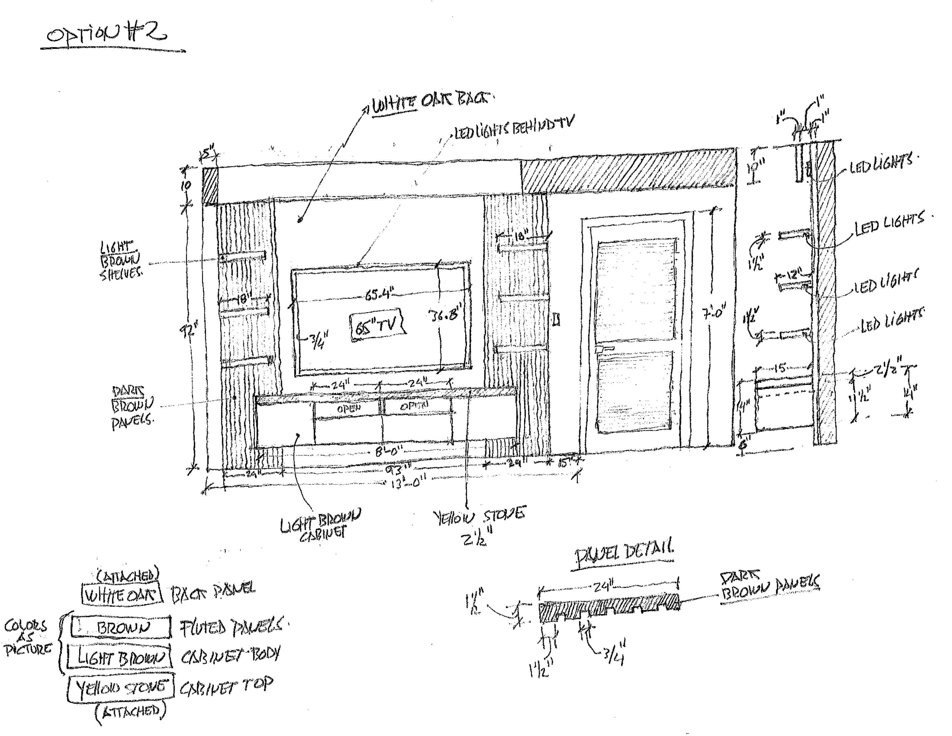 modernist interior shot render a modern interior living room design featuring a sophisticated entertainment wall unit the backdrop is a sleek white oak panel giving a clean contemporary look highlight the wall with subtle led lights strategically placed behind the 65 tv providing an ambient glow incorporate dark brown fluted panels on either side seamlessly framing the unit with light brown shelves elegantly integrated for added storage the cabinet body should be in a warm light brown grounding the design while the cabinet top features a luxurious yellow stone finish for contrast the atmosphere is cozy yet modern with a soft and inviting lighting setting the overall color palette is earthy with whites browns and subtle yellows creating a harmonious and stylish living space do a front view architecture