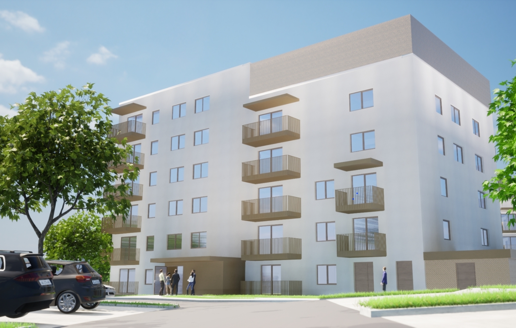 render a modern apartment building with a clean white facade featuring light brown balconies the scene includes a clear blue sky with a few fluffy white clouds and the atmosphere is bright and cheerful add lush green trees on the left casting gentle shadows include parked cars in a dark gray color on a smooth light gray road populate the scene with a few casually dressed people on a walkway at the building s entrance evoking a lively and welcoming ambience