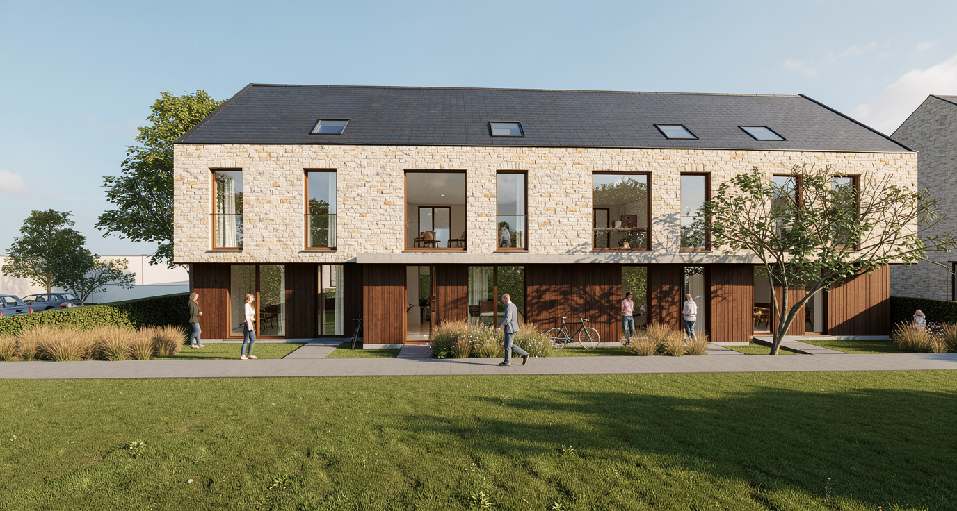 create a high resolution architectural render of a residential house based on the provided drawing the facade must be finished with black charred wood cladding shou sugi ban style using vertical wooden planks with realistic texture grain and subtle variation in tone the material should appear matte to semi matte with visible depth and natural imperfections from the charring process apply photorealistic rendering techniques with global illumination balanced exposure and high material accuracy the overall atmosphere should feel calm contemporary and architecturally precise the upper volume of the building should be clad in light colored facing brick clean and modern with tight and precise mortar joints the brick should be subtle and uniform add a small number of realistic people 2 3 maximum subtly integrated into the scene for scale they should appear natural and casually positioned without drawing attention away from the architecture avoid exaggerated poses or bright clothing