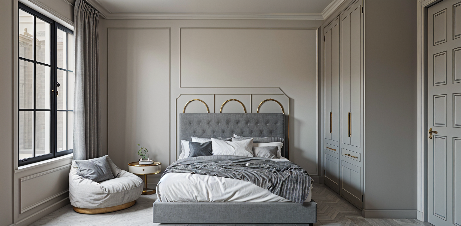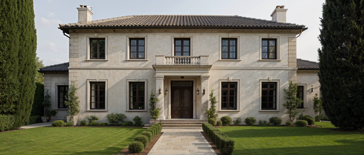 modernist exterior shot sunny afternoon large trees bushy garden edge of path mirrored grey glass architecture