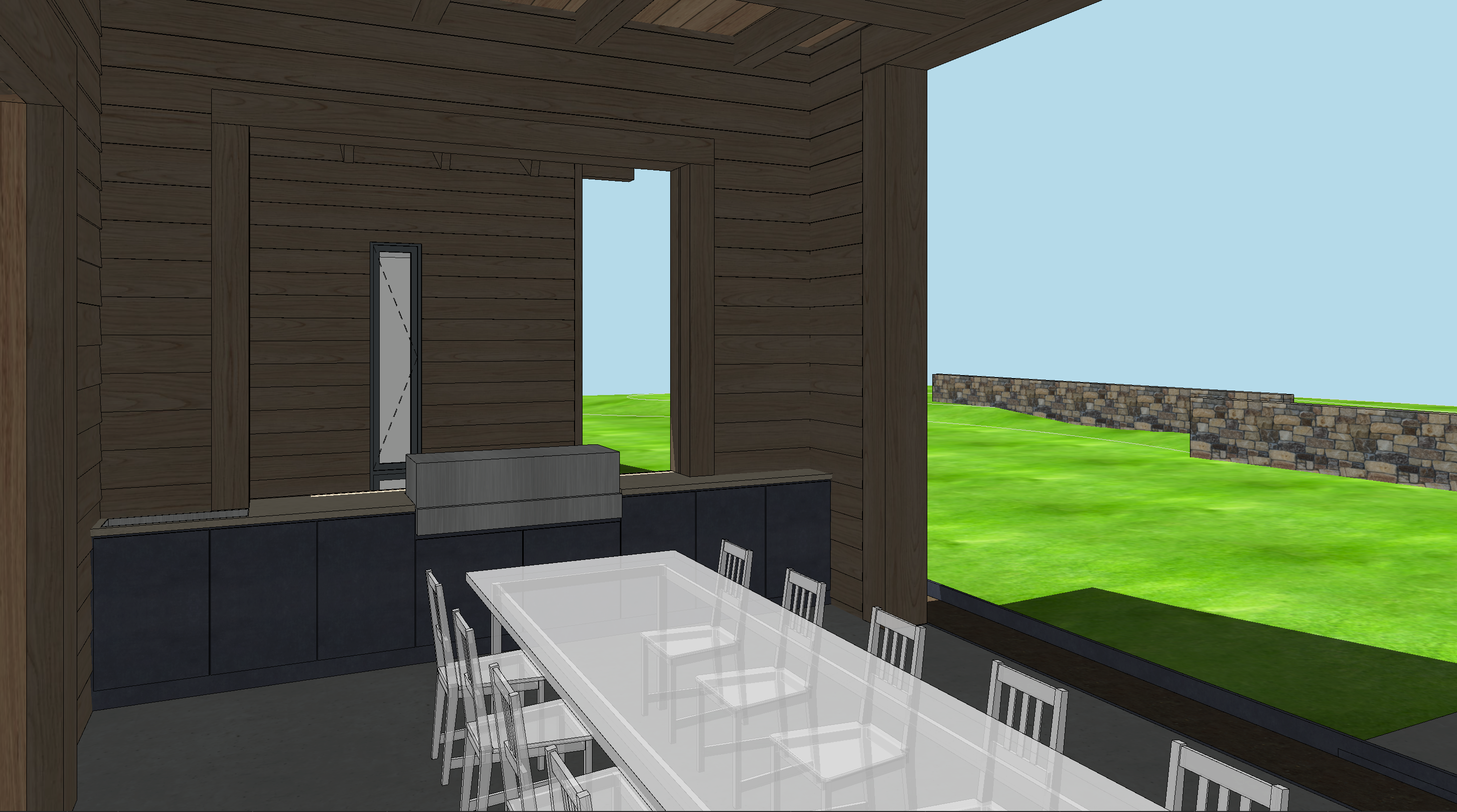 outdoor patio furniture blackened steel cabinets stainless steel grill insert stainless steel sink basin medium light tone brown wood siding with beams a few shades darker mountains of sun valley idaho in the distance people sitting at table enjoying a meal someone opening the grill with a spatula in hand
