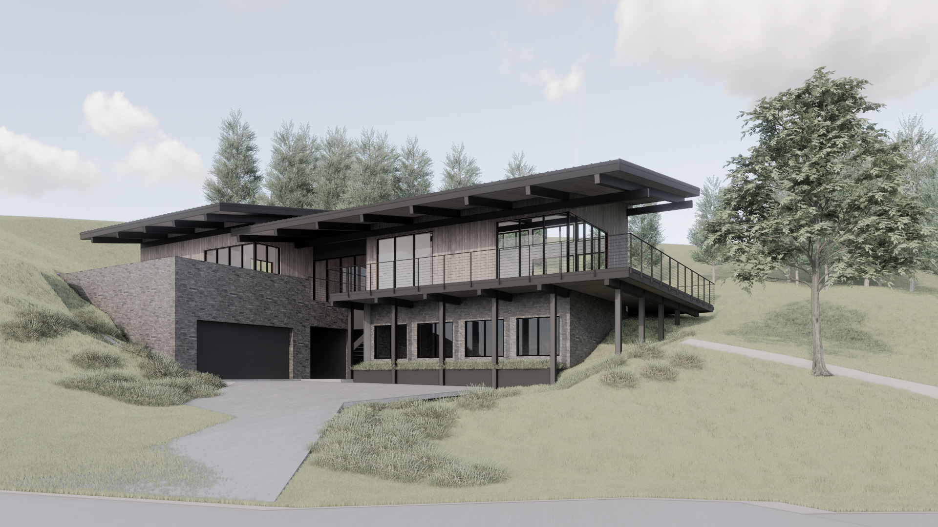render a photorealistic 3d perspective of this house in big sky montana reference the current material style just enhance them dark grey standing seam metal roof vertical wood siding dark stone walls keep model geometry the same windows doors roof walls garage door pavement driveway make a lush vegetation that looks native to big sky montana do not change the view only enhance the current materials and make the landscape nicer vegetation detailed textures in the wood siding and glass reflections and a vibrant clear sky with light atmospheric depth render in hyper realistic architectural visualization quality 8k resolution