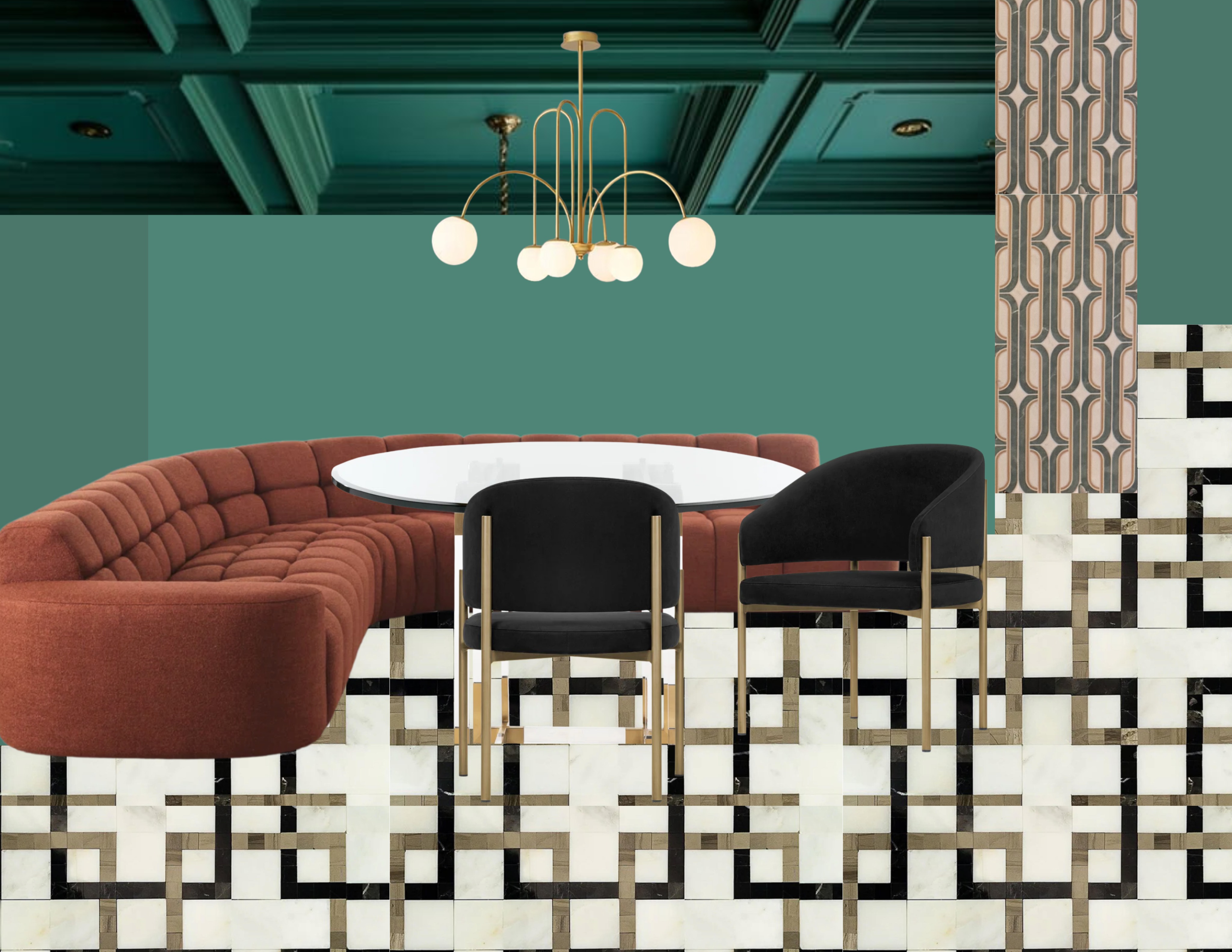 tall long windows on the left side wall coffered ceilings vertical tile on the right hand side is a tiled fireplace that is around the corner from the dining area