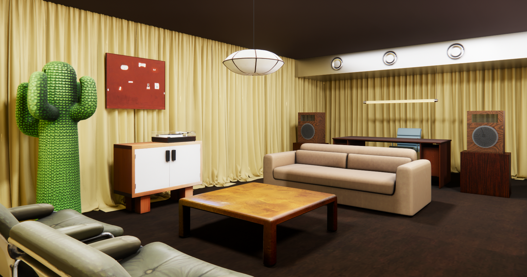 mid century modern lounge interior with a warm cinematic atmosphere viewed from a corner perspective the space is enclosed by soft beige floor to ceiling curtains on all walls creating an intimate studio like environment the flooring is a rich chocolate brown low pile carpet with a dense tight weave subtle tonal variation matte finish and slight compression under furniture in the foreground two olive green leather lounge chairs with chrome frames are partially visible on the left a low rectangular burl wood coffee table sits centrally a cream upholstered sofa in soft velvet fabric is positioned mid room facing the viewer with realistic nap direction subtle sheen variation and gentle tonal shifts depending on light on the left wall a sculptural cactus style plant stands beside a small wooden cabinet with white doors topped with a record player above it hangs a red minimalist artwork in the background a wooden desk with a chair is centered against the curtain wall on either side are large vintage style speakers with realistic walnut wood veneer showing natural grain variation fine pores and subtle color shifts elevated on solid walnut pedestals a slim horizontal pendant light hangs above the desk mid century modern lounge interior with a warm cinematic atmosphere viewed from a corner perspective the space is enclosed by soft beige floor to ceiling curtains on all walls creating an intimate studio like environment the flooring is a rich chocolate brown low pile carpet with a dense tight weave subtle tonal variation matte finish and slight compression under furniture in the foreground two olive green leather lounge chairs with chrome frames are partially visible on the left a low rectangular burl wood coffee table sits centrally a cream upholstered sofa in soft velvet fabric is positioned mid room facing the viewer with realistic nap direction subtle sheen variation and gentle tonal shifts depending on light on the left wall a sculptural cactus style plant stands beside a small light wood cabinet with white lacquer doors topped with a record player above it hangs a red minimalist artwork in the background a wooden desk with a chair is centered against the curtain wall on either side are large vintage style speakers with realistic walnut wood veneer showing natural grain variation fine pores and subtle color shifts elevated on solid walnut pedestals a slim horizontal pendant light hangs above the desk along the upper wall line runs an exposed linear ac duct with evenly spaced circular vents a soft diffused ceiling pendant light hangs centrally casting warm ambient lighting with gentle shadows 1970s retro aesthetic earthy tones highly detailed materials realistic textures photorealistic rendering interior design visualization 4k