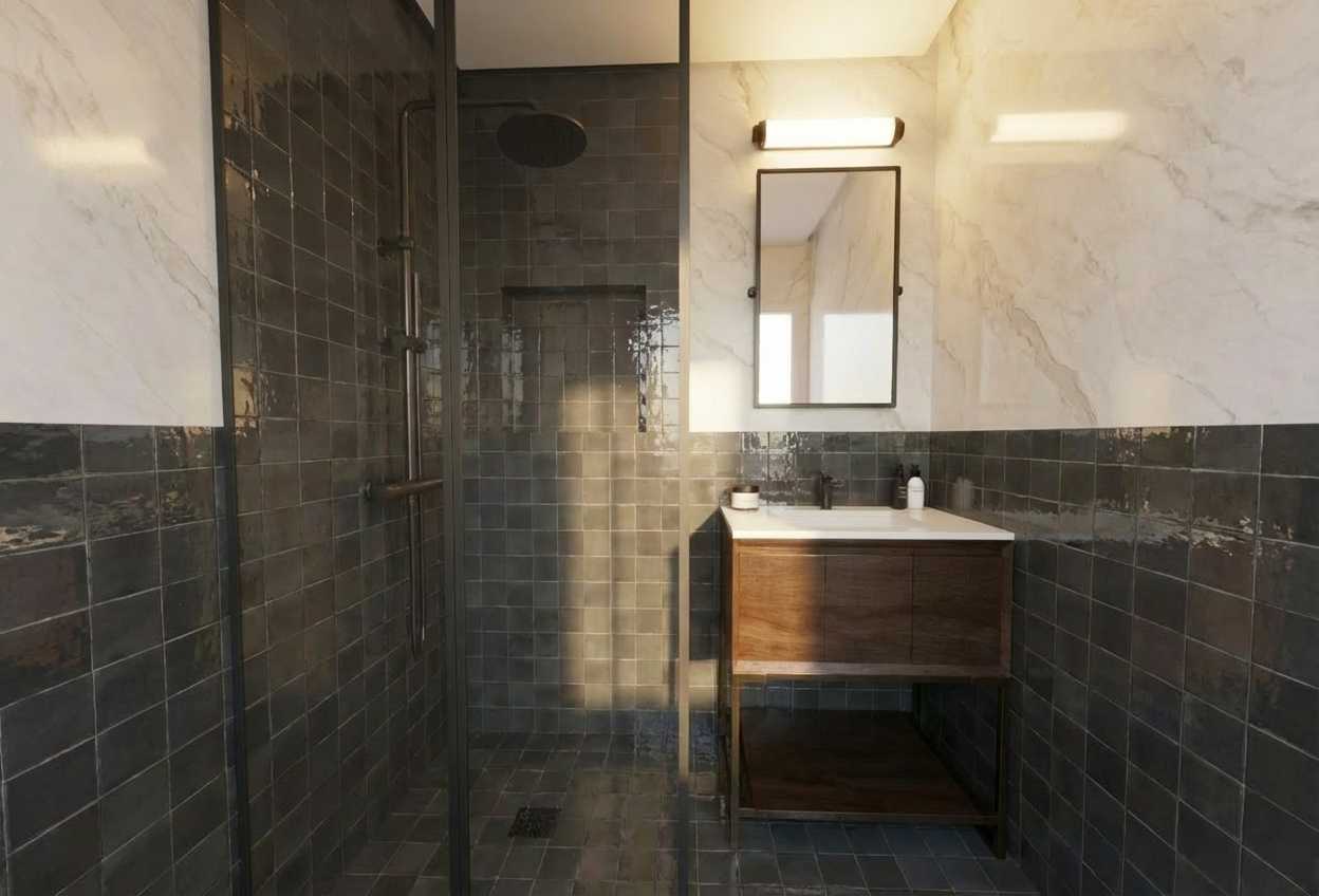 add a wooden frame at the edge of the tiles between tiles and white marble