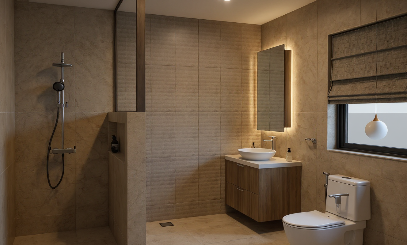 maintain tile texture feature wall beside vanity beige tone floor and wall tiles with less grain pattern lower contrast upper left ceiling cove light
