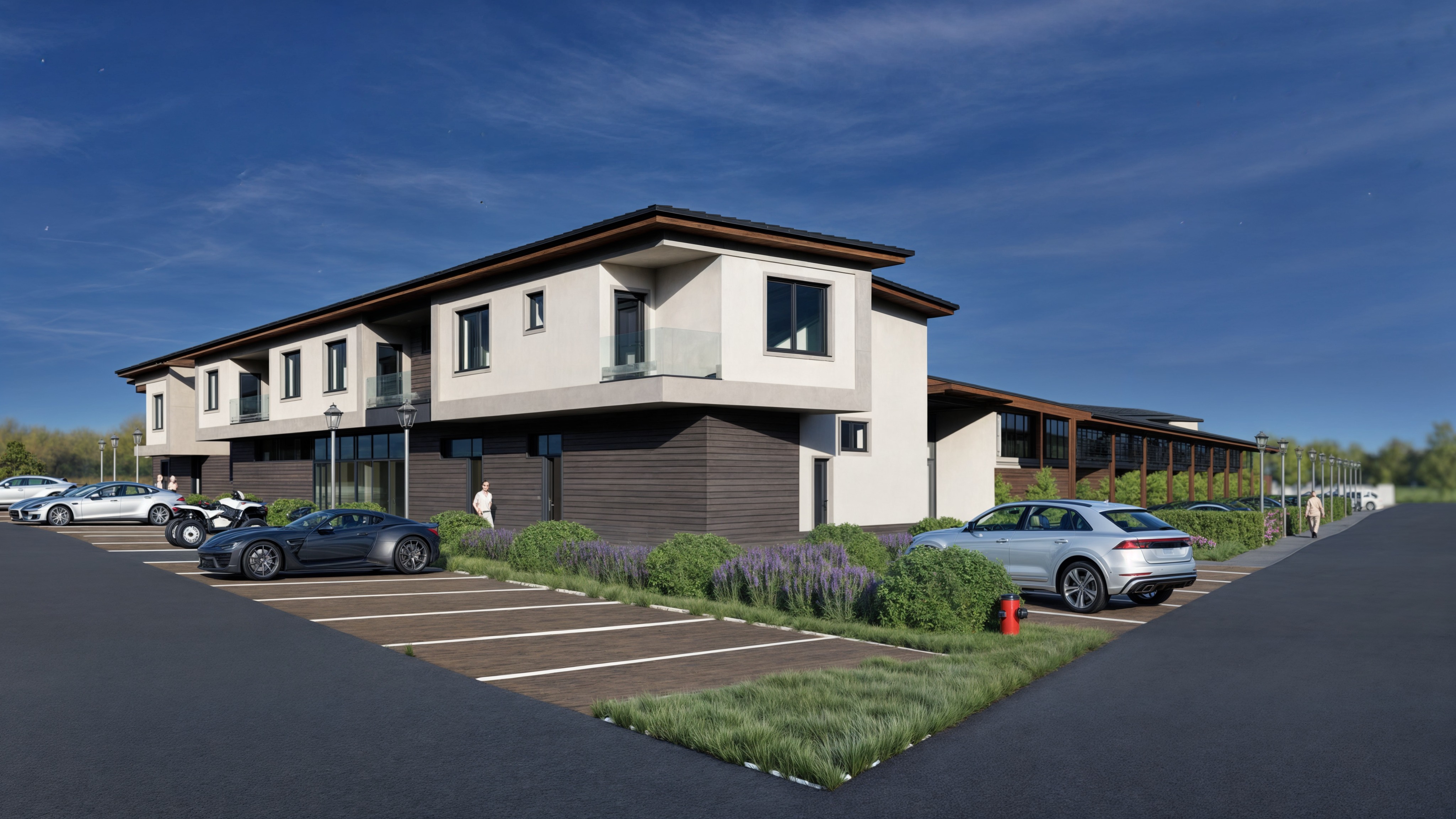 a modern residential building exterior featuring a clean white plaster facade combined with dark wooden cladding elements the architecture is minimal and elegant with simple volumes recessed balconies and large windows the wood has a deep rich tone creating a strong contrast with the light facade and enhancing the premium look the scene is illuminated with warm soft natural light creating a cozy and inviting atmosphere the parking area features slightly wet asphalt and paving with subtle reflections adding realism and a refined visual mood surrounding landscaping includes low greenery ornamental grasses and flowering plants arranged in a clean and natural composition cars are parked naturally and people are subtly integrated into the scene enhancing the sense of scale and livability the lighting is warm and directional with soft shadows and gentle highlights on materials the overall mood is cozy modern and high end with a photorealistic architectural visualization