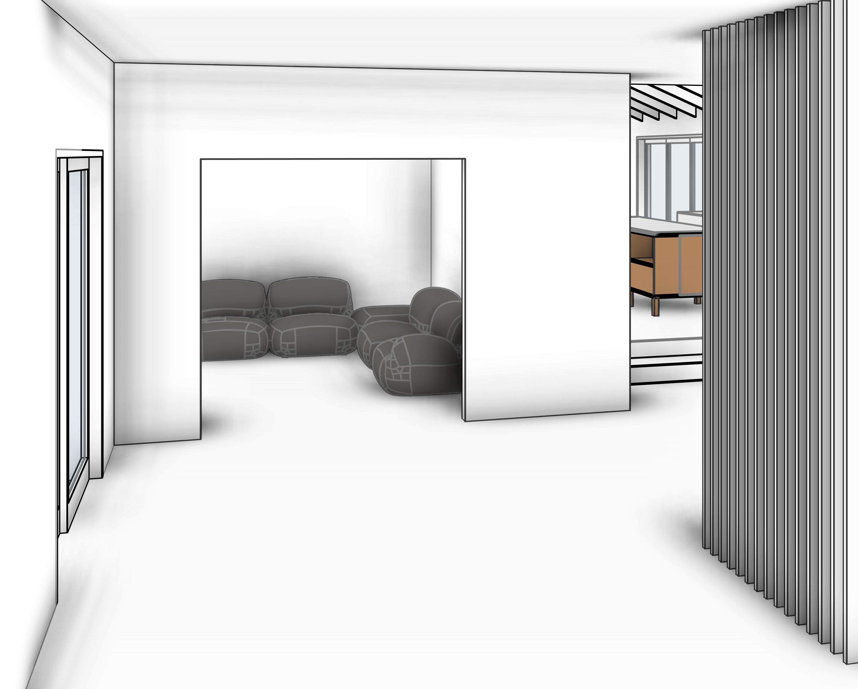 a warm contemporary kitchen interior with joinery in rich timber veneer integrated appliances and minimal visible hardware rendered in soft natural daylight the space features clean rectilinear forms warm white walls and a light toned subtly veined stone benchtop and splashback that add refined texture without dominating the composition include a simple wall sconce on either side of the window and a few restrained styling elements such as a vase with greenery to bring life to the scene while keeping the overall look uncluttered and sophisticated the floor is a greige concrete look large format tile emphasise high end materials precise detailing and a calm inviting atmosphere suitable for a client presentation with a high resolution photoreal finish and a slightly elevated camera angle that shows the length of the cabinetry and the connection to the adjacent living space