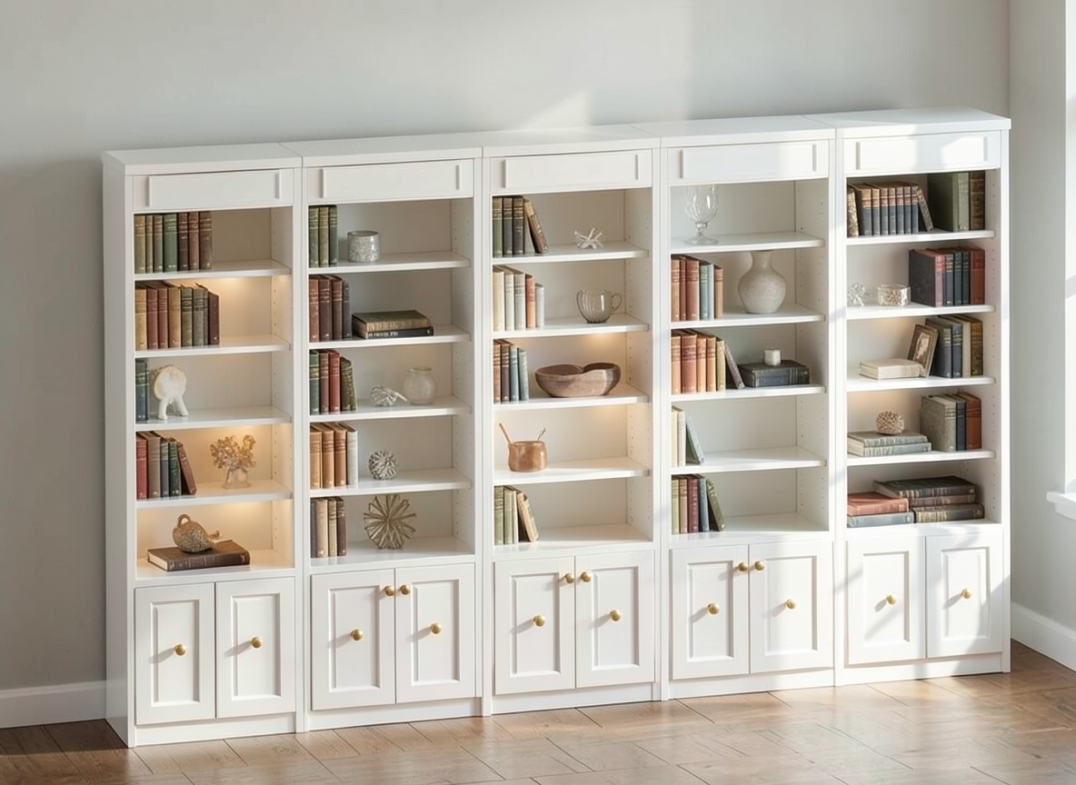 keep exactly the same white shelfs with books gold round pulls blue outside pulls only on center of doors keep same color and style keep blue all around