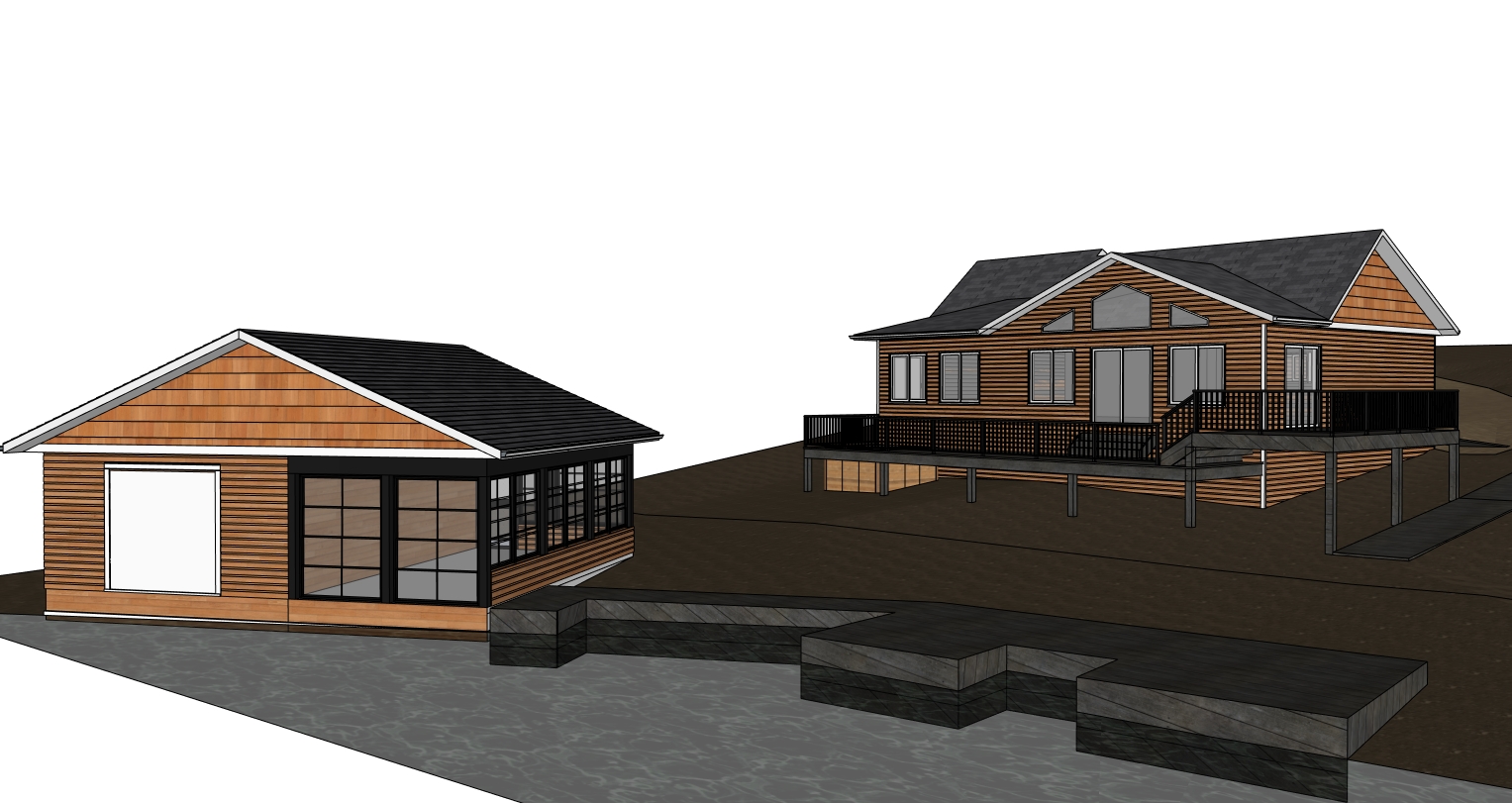 lakefront home is in cabin country on the candian shield lots of coniferous trees and a few birch and poplar surround the home in the background building in the foreground is a boathouse that is right on the lake sun is setting on the building behind the camera