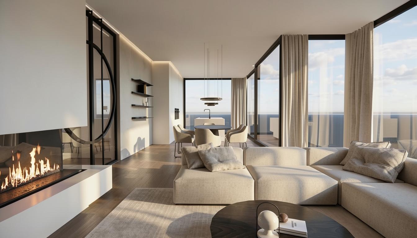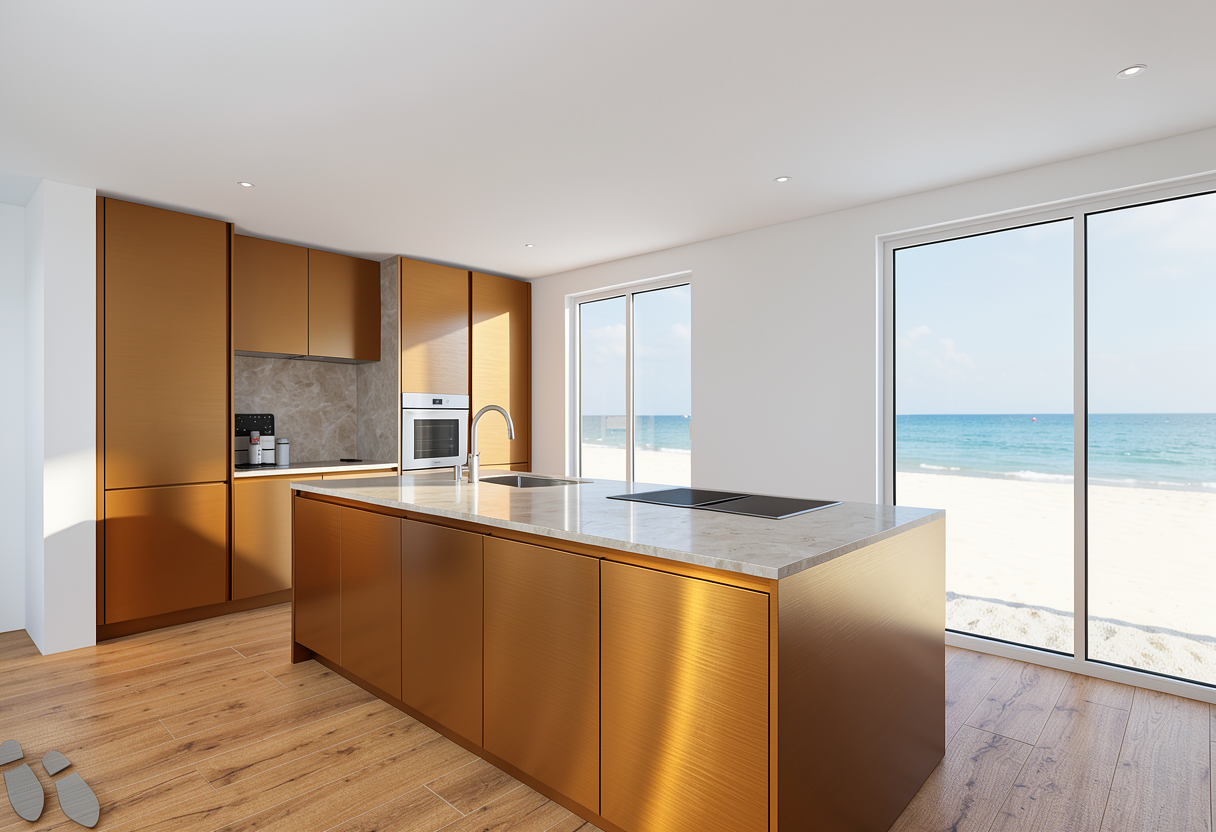 das ist eine moderne k che die frontfarbe der hochschrankzeile in hell beige und frontfarbe der insel bronce geb rstet die gardine vor dem fenster aber sonnenlicht kommt auf den boden wasserarmatur in gunmetal farbe nische mit indirekte beleuchtung