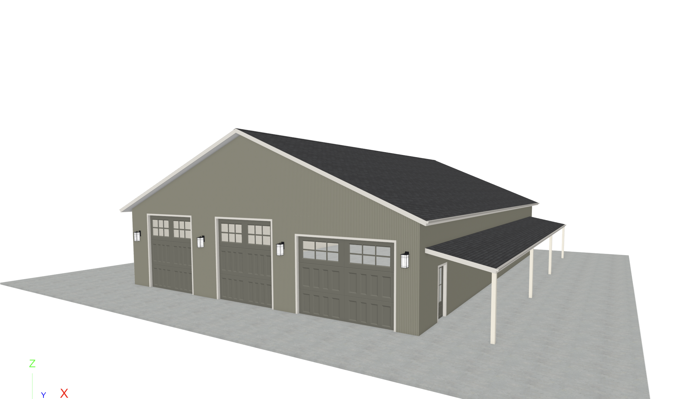 create a outdoor background behind this barn with trees and grass extend the driveway to the garage doors