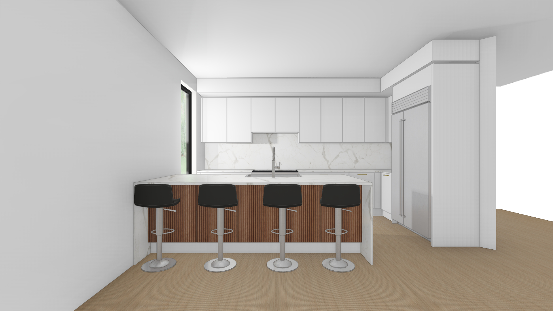 add white vase with cherry blossoms on the island moody light sunny and foggy weather behind the windows newton ma cabinets in matte flat doors do not change cabinets nor add open shelves don t add new cabinets light under the wall cabinets all cabinet handles and faucet are polished chrome make groove on the island doors 5 times smaller don t add new windows