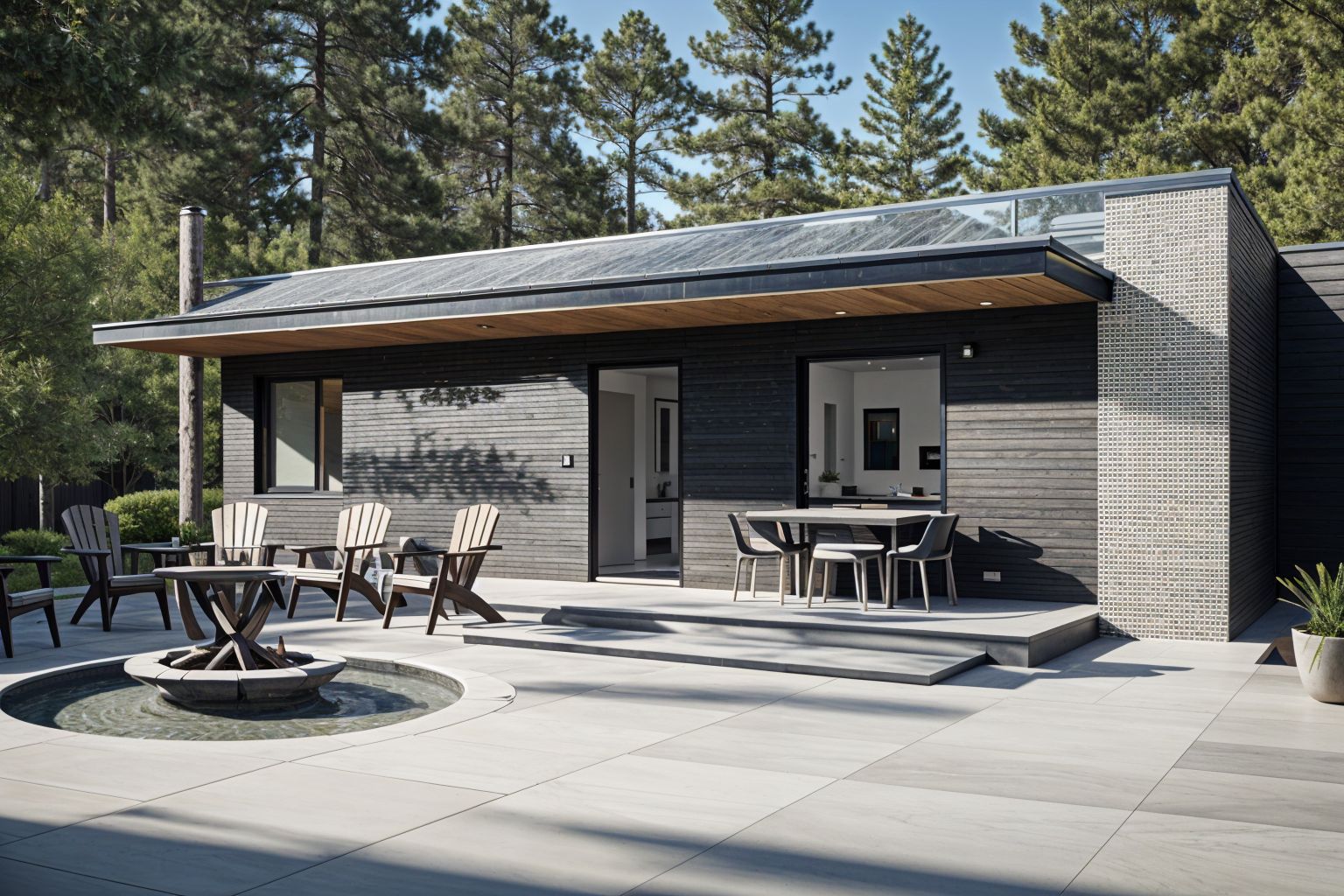 modernist exterior shot keep all the colours and grass the same only change the roof remove the sloped roof portion and just make it flat to match the right side of the unit architecture
