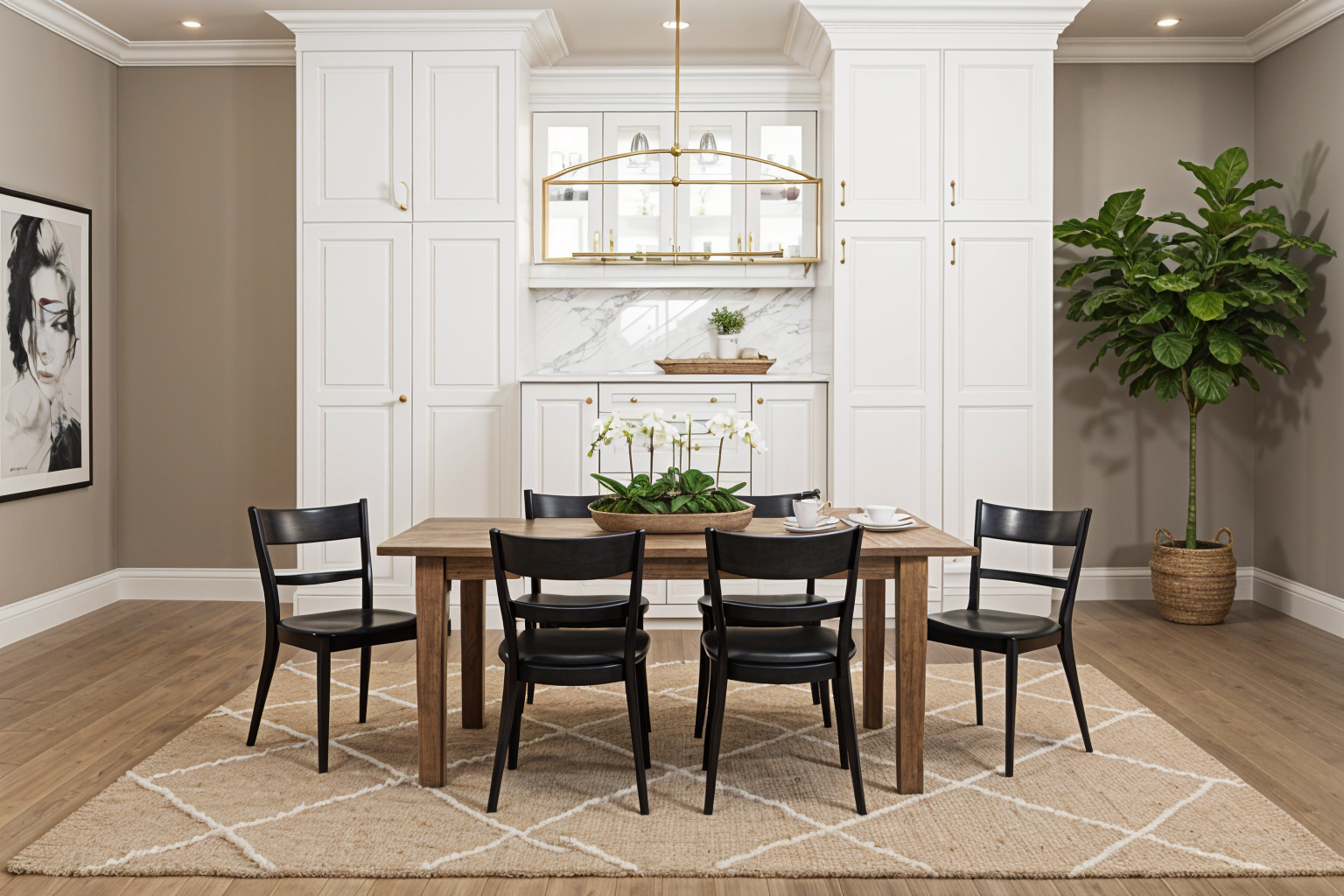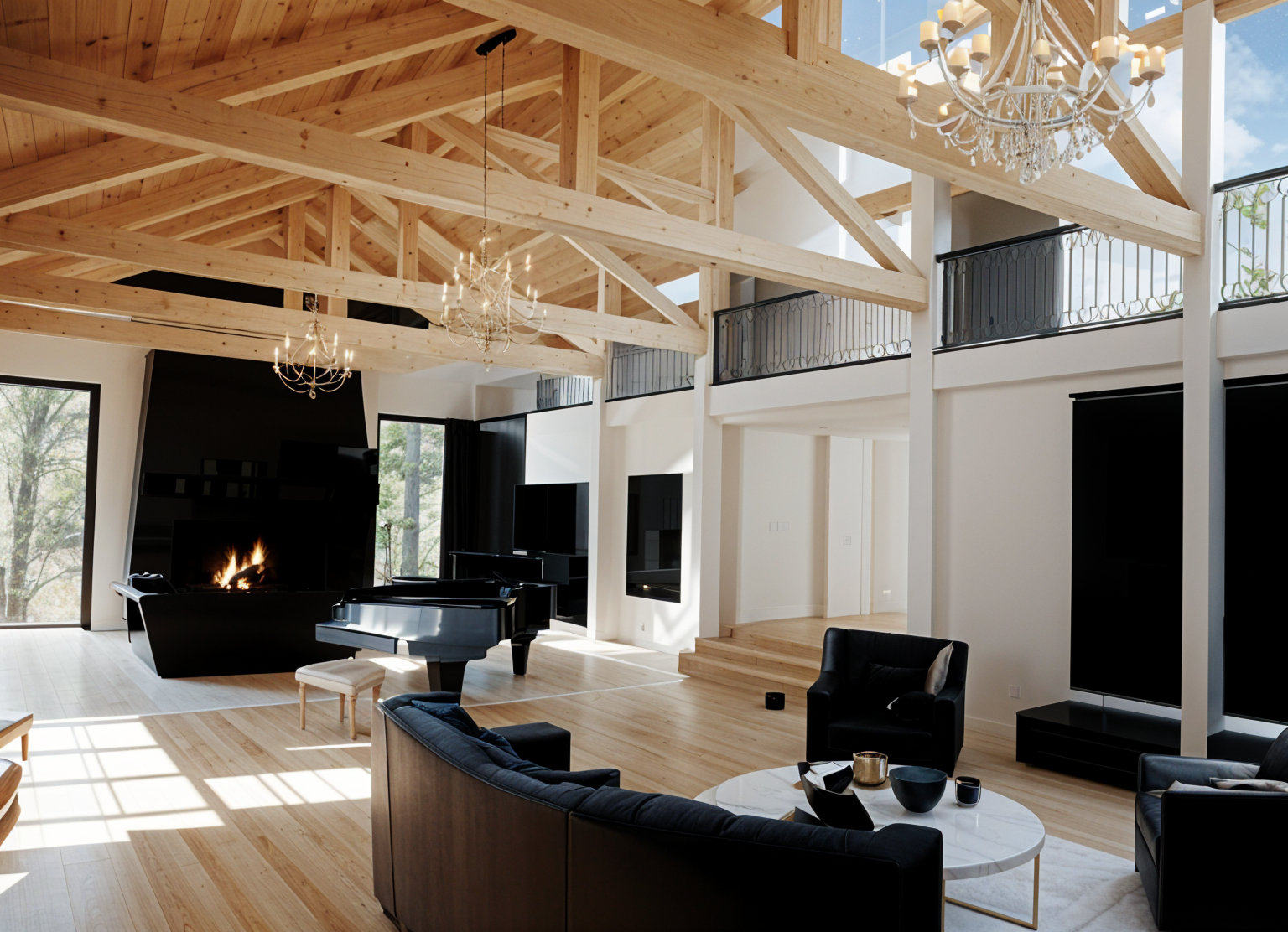 render a beautiful serene suburban house in a modern farmhouse style the exterior is painted a soft white color with contrasting creamy white trims and a black shingle roof the front porch features painted wood columns and a painted front door with sidelites large windows fill the facade allowing soft golden sunlight to create a welcoming atmosphere the garage door is a classic white with black hardware surround the house with lush green grass and colorful flowers the sky is a clear blue with soft fluffy white clouds the atmosphere is peaceful and inviting exuding a sense of comfort and home