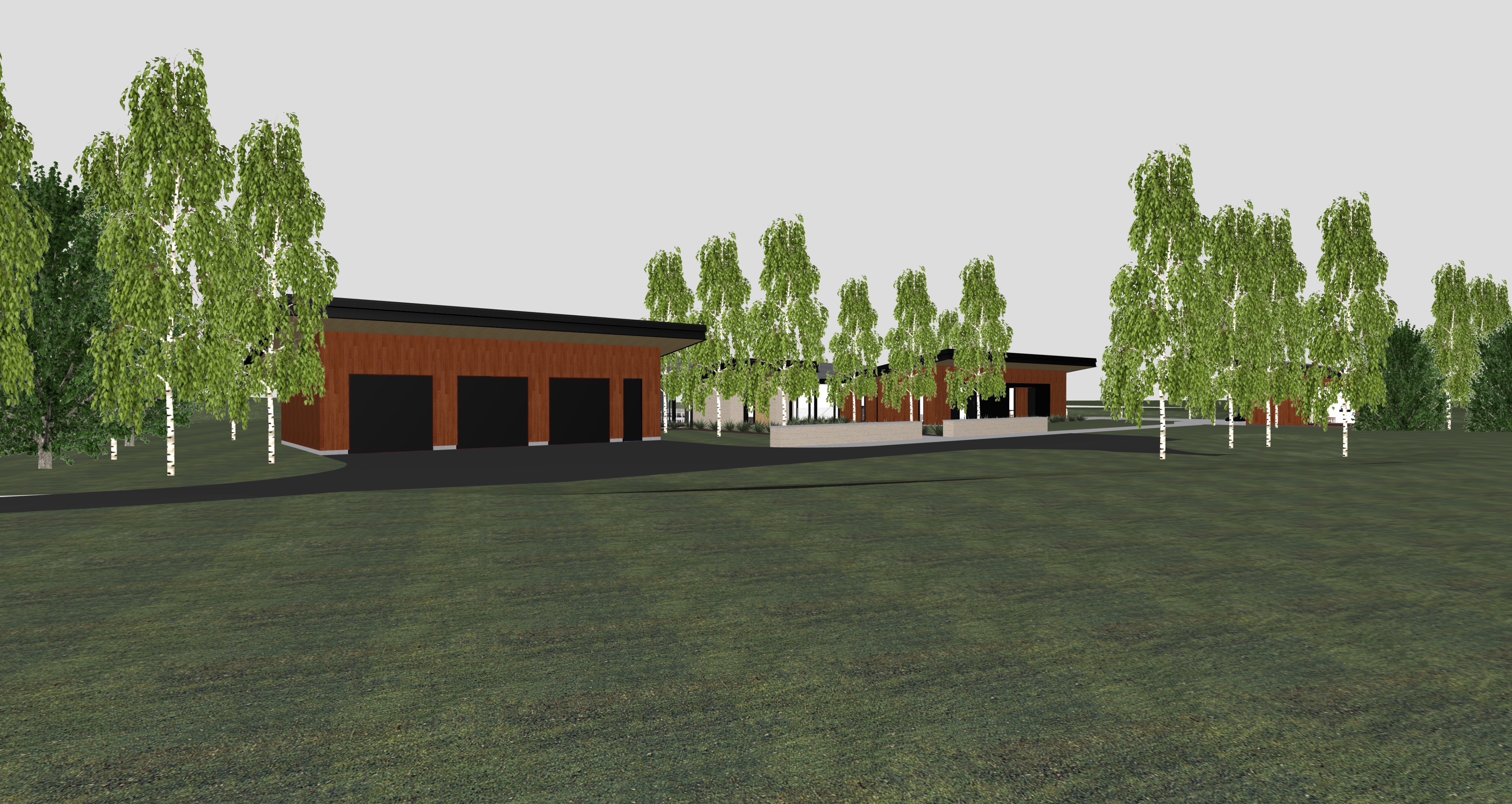 teton mountain range in background low plants and shrubs around edge of building fire in fireplace gap refined furniture tan blonde slat ceiling black steel cladding dark brown reddish wood slat siding with minimal seams aspen pine trees dotting landscape replace existing birch tree models with better refined aspen trees dark green semi wild grass