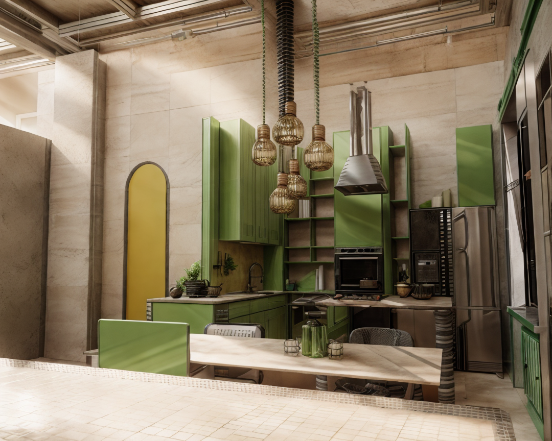 take this floor plan and make it into a fun tulum vibe mexican restaurant with yellow white and blues and greens architecture