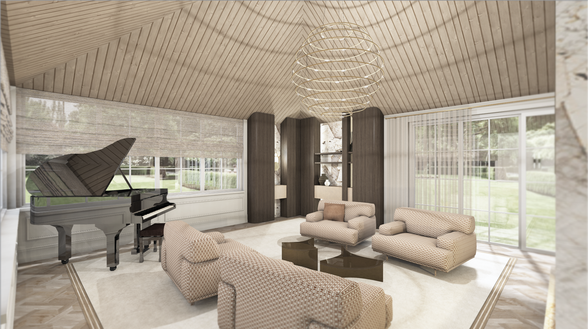 enhance this image to ultra photorealistic quality preserve the exact geometry proportions layout materials colors textures and all design details exactly as shown do not add remove redesign restyle or reinterpret anything do not change materials colors lighting direction furniture dimensions or composition no new objects no decorative additions no artistic reinterpretation only improve realistic lighting natural shadows material realism true to life surface rendering reflections depth and camera realism high end architectural photography quality the final image must be a 1 1 faithful photorealistic version of the original design the ceiling can be plastered in the light colour in stead of wood add some detailling to the ceiling