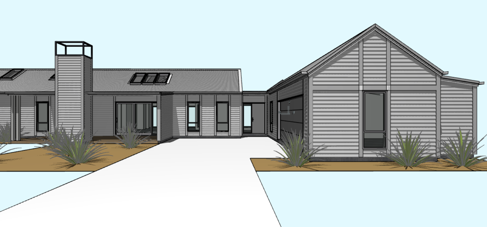 white metal roof white weatherboard cladding white window frames extensive native planting background trees lawns sunset interior lights on