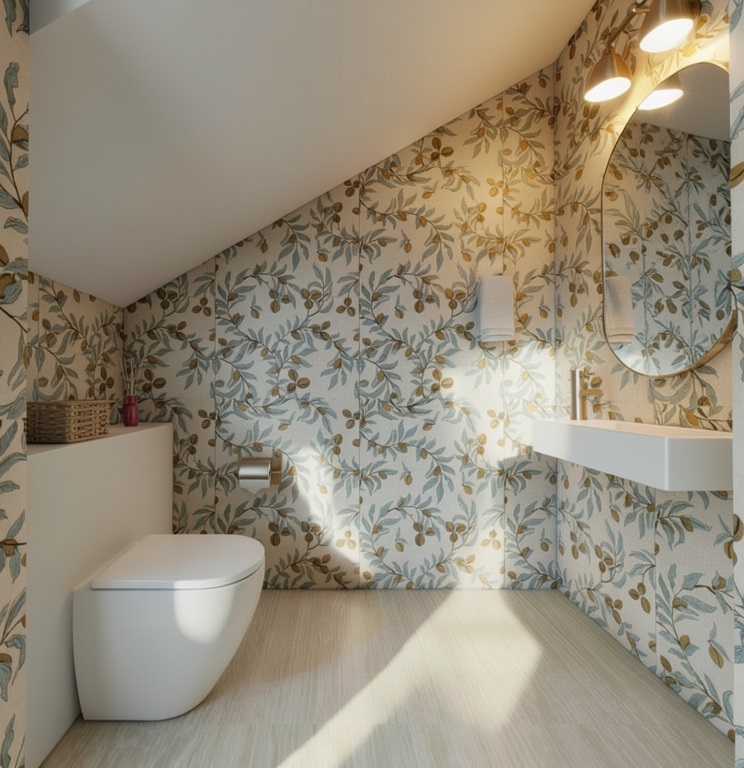 add a realistic baseboard to this bathroom scene matching the style and proportions of the space use a clean modern white baseboard with subtle shadowing and soft edge detail ensure it wraps around all visible walls including under the sink and behind the toilet without disrupting the wallpaper pattern maintain accurate scale and lighting consistency with natural highlights and soft shadows to integrate the baseboard seamlessly into the scene