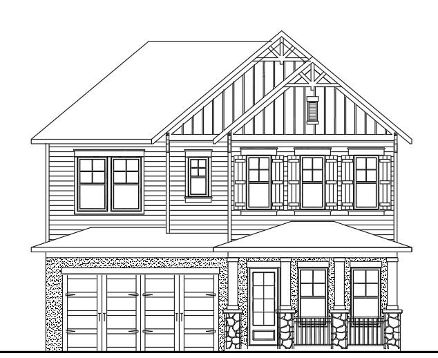 a charming two story coastal craftsman house with a gabled roof painted in soft beige with white trim the upper section features sage green siding adorned with dark wood shutters the front porch has stone pillars in shades of gray and a dark wood front door the garage doors are brown with no windows the overall atmosphere is warm and inviting set against a clear blue sky with fluffy white clouds and surrounded by lush green tropical landscaping and palm trees bright and sunny afternoon light enhances the serene and welcoming feel architecture