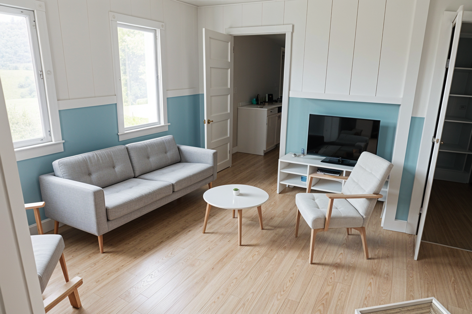 clean this up and furnish it like a modern bedroom paint the walls white keep the structure of the walls and windows same don t change the room