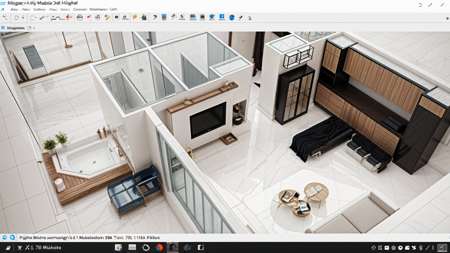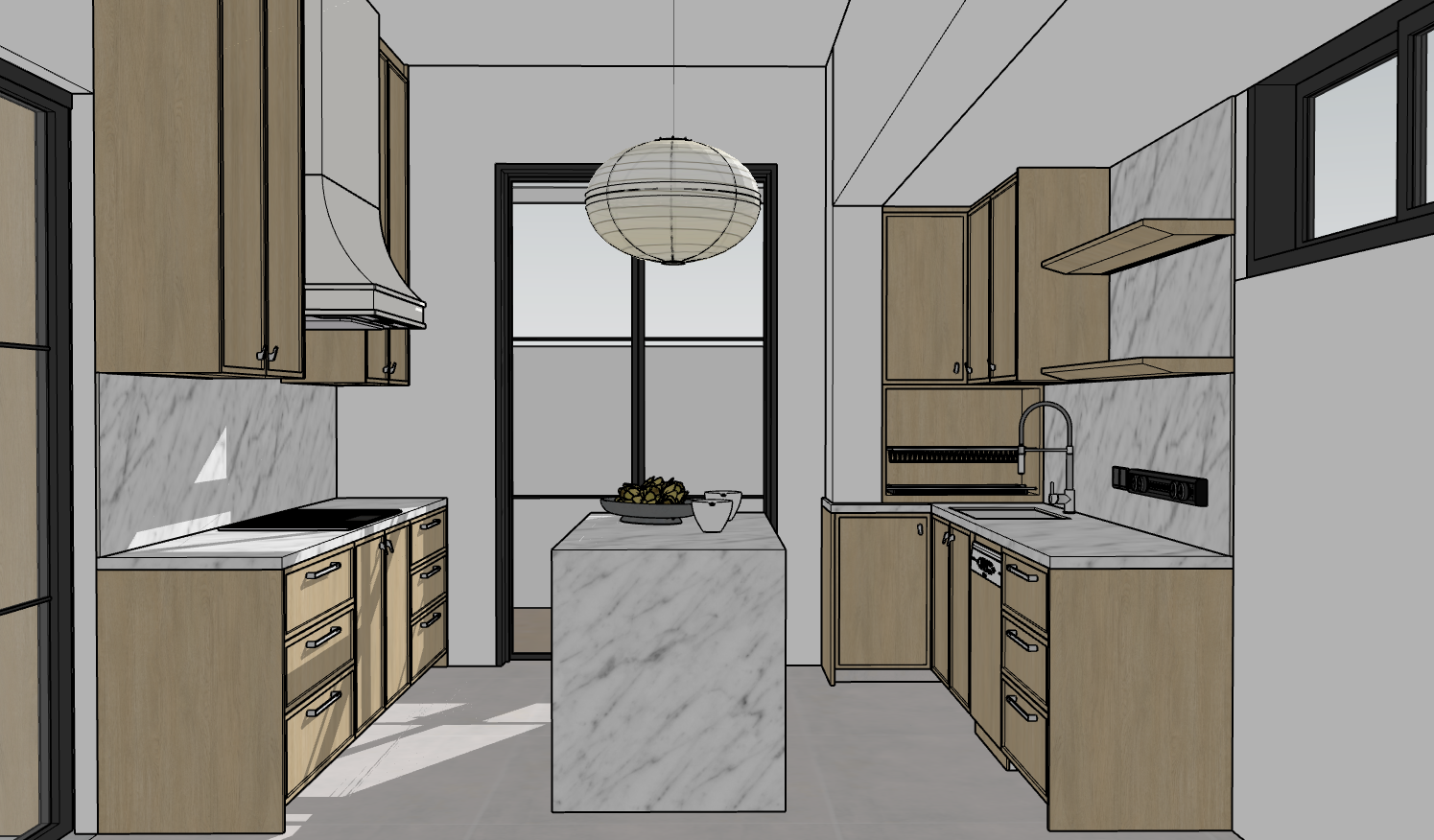lights turned on spotlight on ceiling glossy carrara marble counter top and backsplash white wood panels