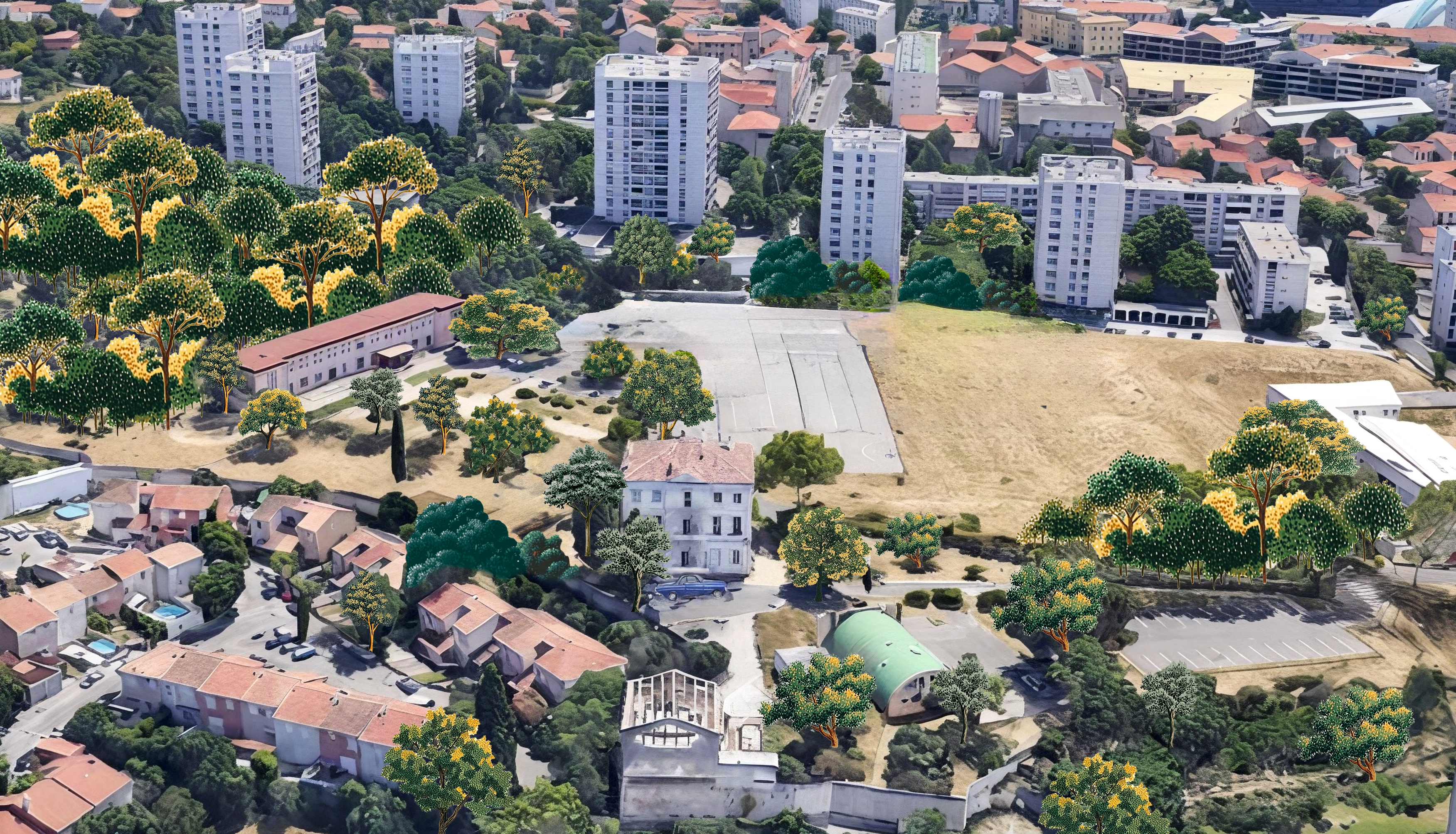 make a beautiful realistic aerial view render of this site
