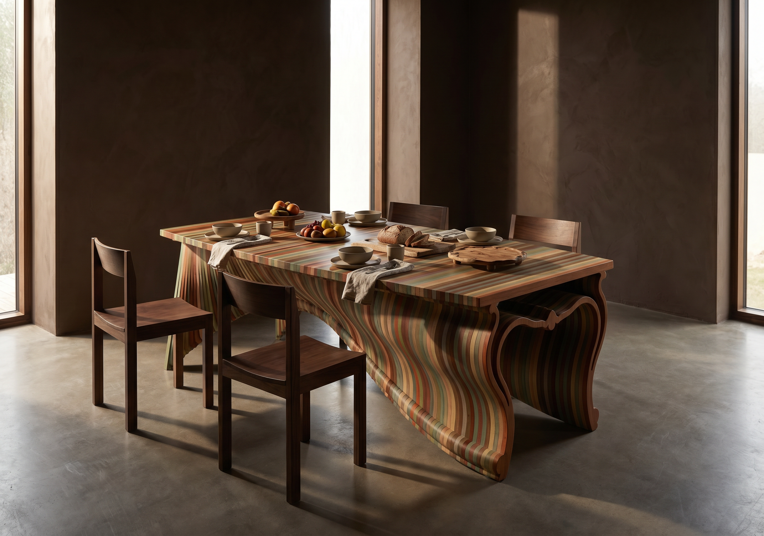 minimalist dark brown simple etheral interior in charlotte taylor style dramatic light keep wooden colorful table design add a few minimalist wooden chairs all chairs are the same fill up the table with minimalist food make vertical image