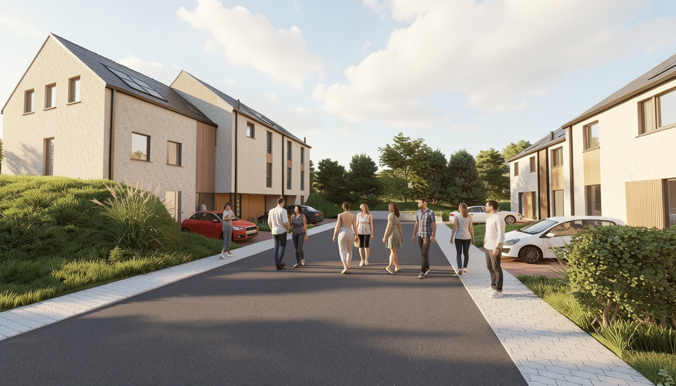 photorealistic architectural render of a modern minimalist white apartment building 3 4 stories flat roof clean cubic volumes continuous external fa ade screen made of thin vertical aluminum louvers wrapping around balconies evenly spaced slats forming a semi transparent brise soleil glass sliding doors recessed behind the screen soft warm golden hour lighting long shadows smooth white plaster walls minimal landscaping contemporary architecture sharp lines high detail realistic materials