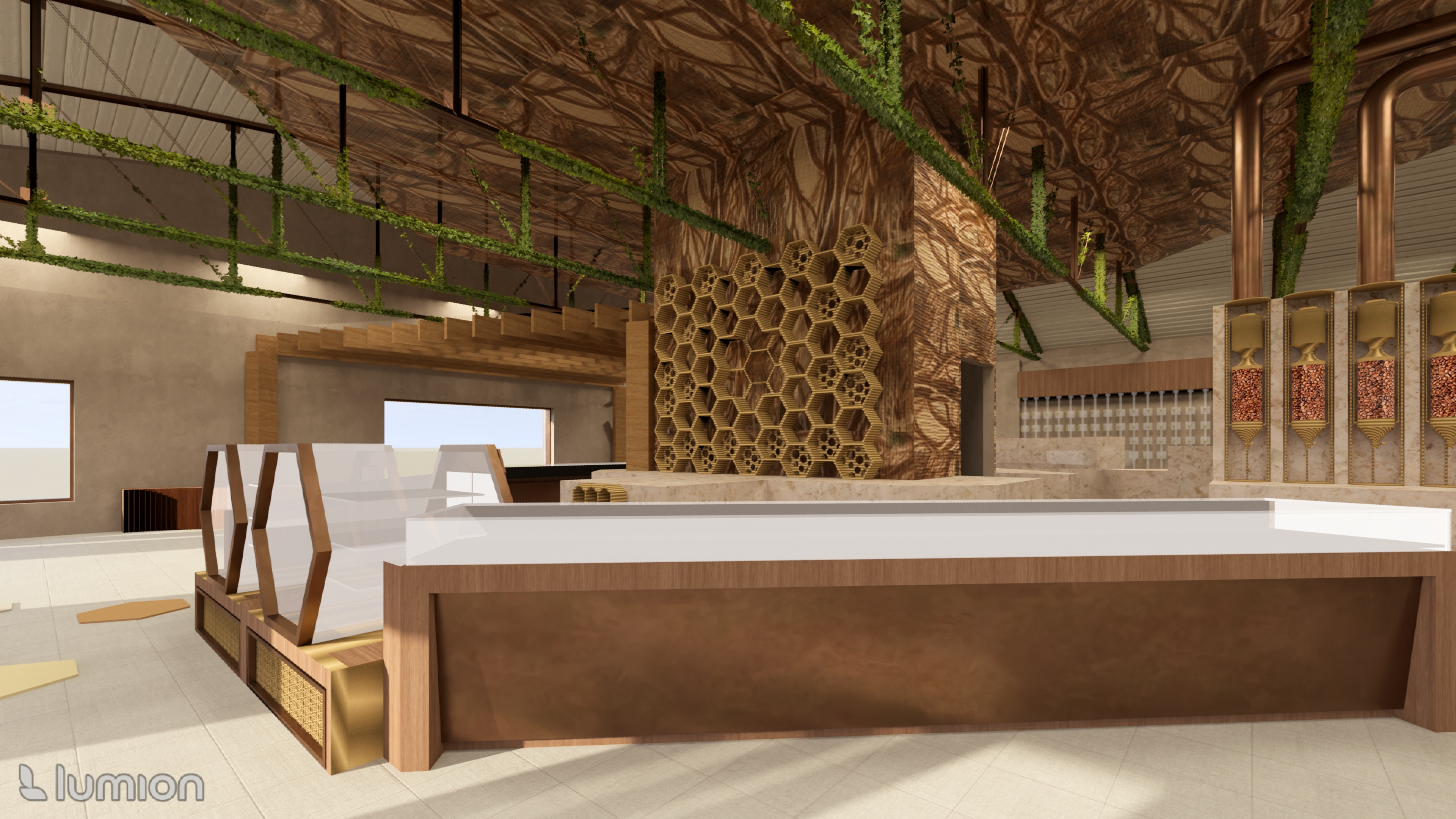 add chocolate boxes in glass and honey jars in the existing hexagonal glass display