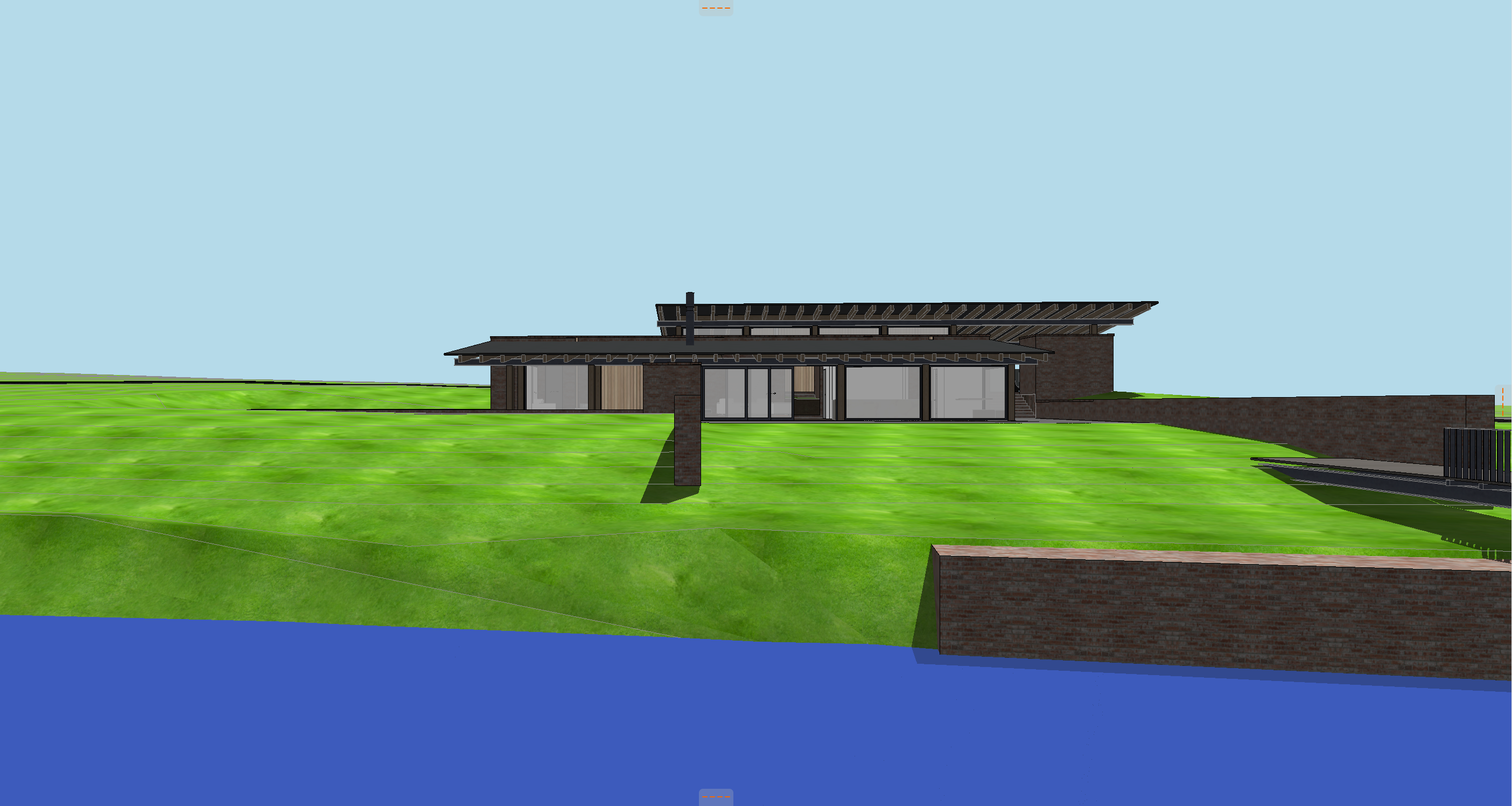 antique brick house with timber columns steel beams glass windows and a standing seam roof wild lousiana grasses and vibrant wildflowers all the way to house yellow pine trees in the background lake in the distance clouds in the sky create a natural looking shoreline
