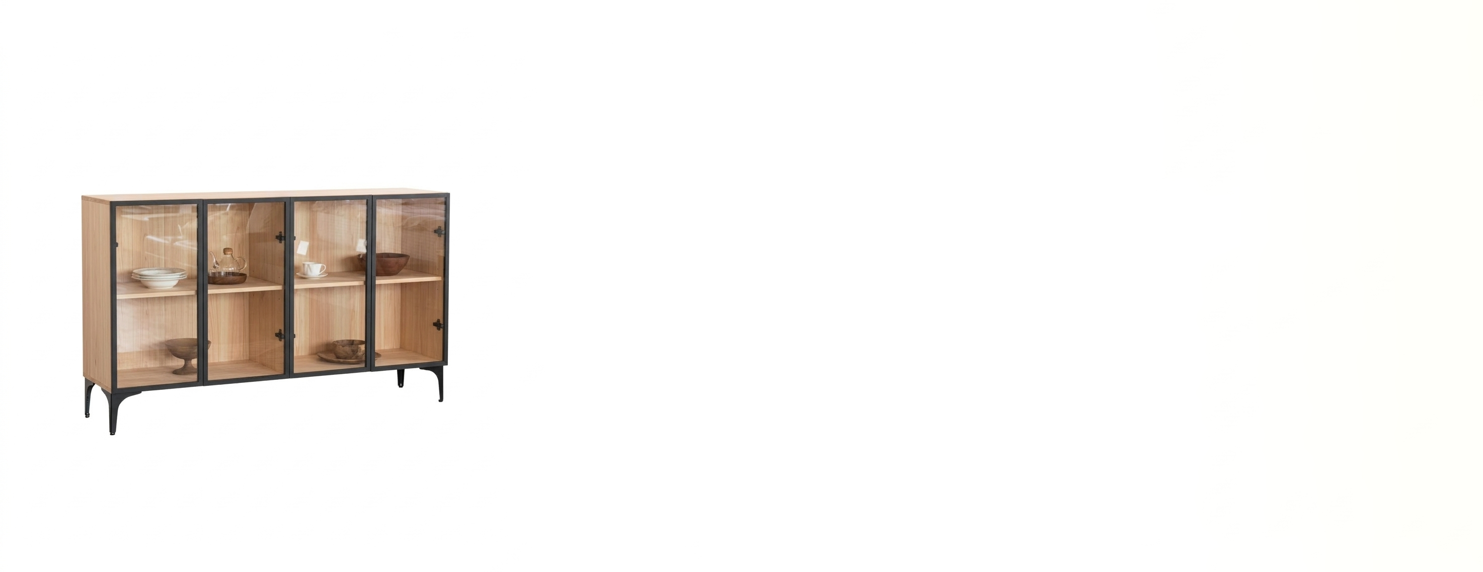 modernist exterior shot replace the current plain background with a warm cozy modern living room interior keep the display cabinet exactly the same do not change its design size color wood grain glass doors black metal frame legs angle or perspective the cabinet must remain in the exact same position on the left side of the image use a warm creamwall behind the cabinet the right side should remain mostly empty showing a clean wall with soft natural shadows for breathing space add light oak flooring include soft natural daylight from the right side casting gentle warm light onto the cabinet to enhance the wood texture subtle cozy elements can be added near the cabinet only such as a small neutral rug or a faint wall shadow but keep the right side uncluttered architecture
