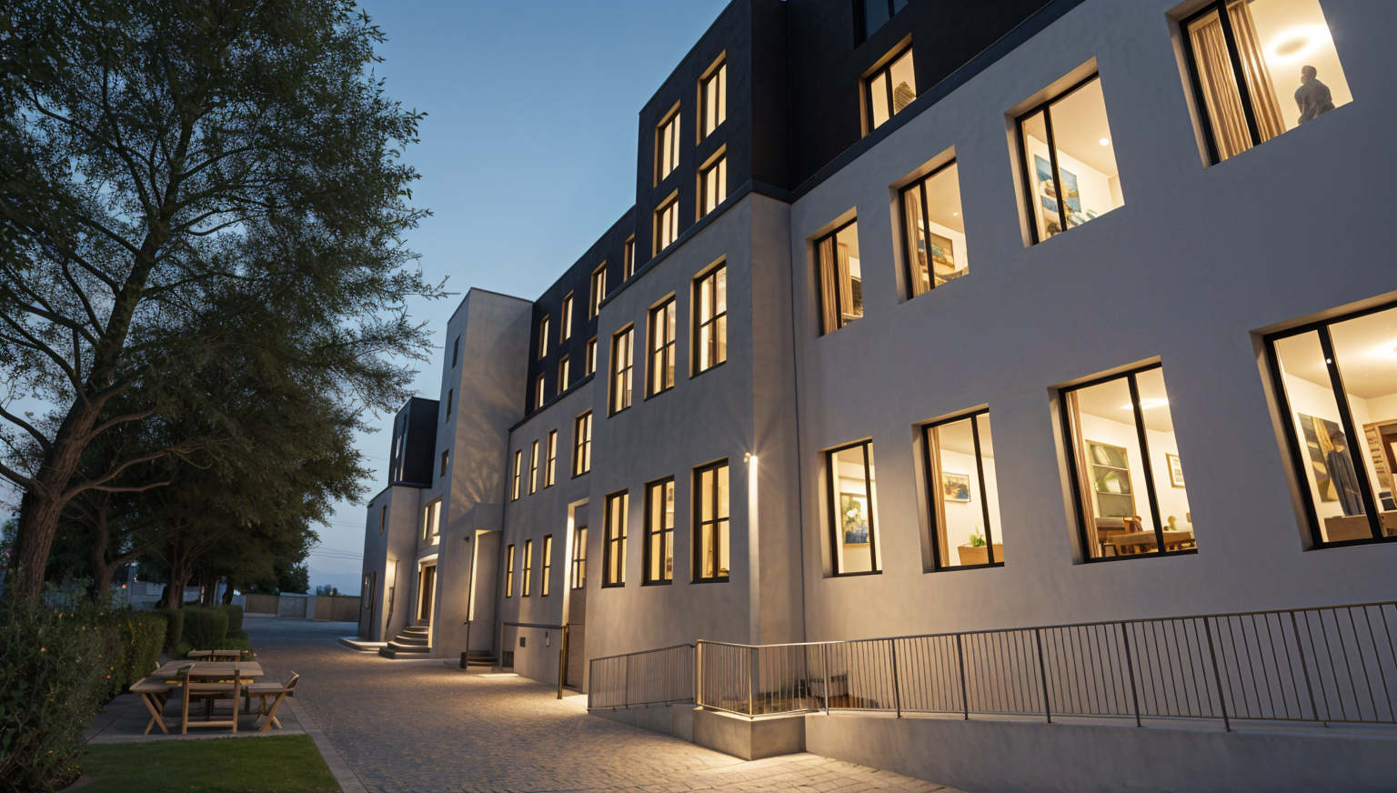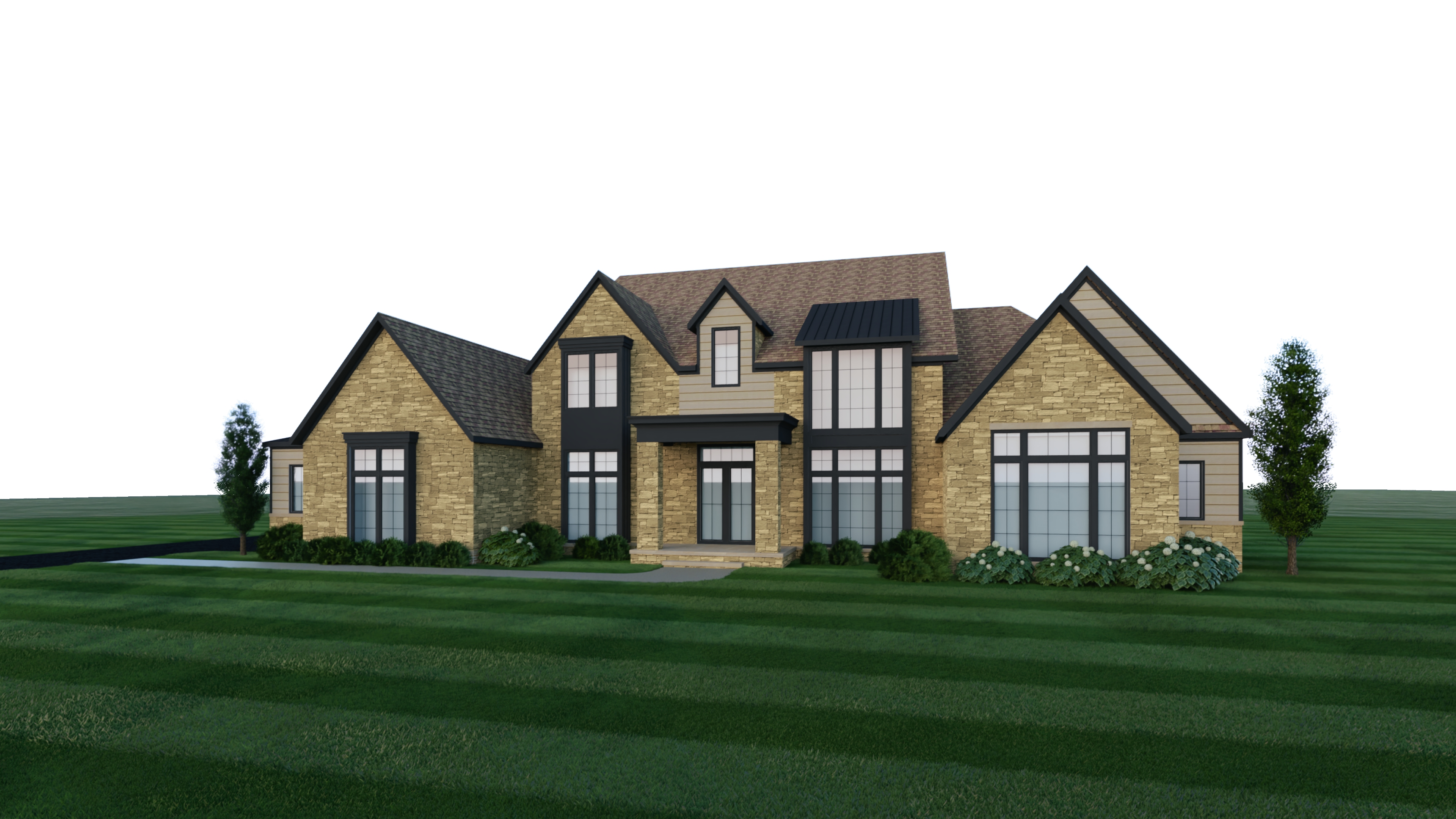 realistic manicured lawn sunset bright windows wooded background tall landscape