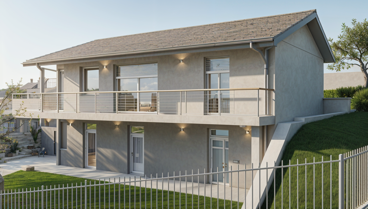 preserve original architecture geometry and camera angle do not modify structure or design enhance realism with physically accurate lighting bright sunny day with natural daylight soft realistic shadows maintain true material colors neutral grey ground floor warm beige first floor realistic plaster texture with subtle roughness and micro imperfections natural green garden with realistic grass texture and varied tones slight depth soft ambient occlusion global illumination professional architectural photography high dynamic range sharp details