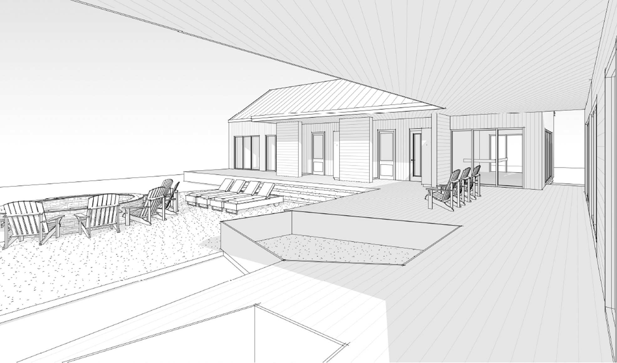 rear view of a clean modern spa architectural exterior rendered in cinematic vibrant golden hour lighting with blue skies mountain modern style black vertical wood siding beautifully lush green manicured landscape around structure black standing seam metal roof prominent cinematic oregon coast vegetation with a forrest of trees behind the thick forrest trees behind the spa high fidelity photorealistic visualization crisp shadow falloff refined facade geometry soft atmospheric depth premium architectural photography mood ultra clean composition and materials dark trim around windows soaking tub in the foreground light wood decking