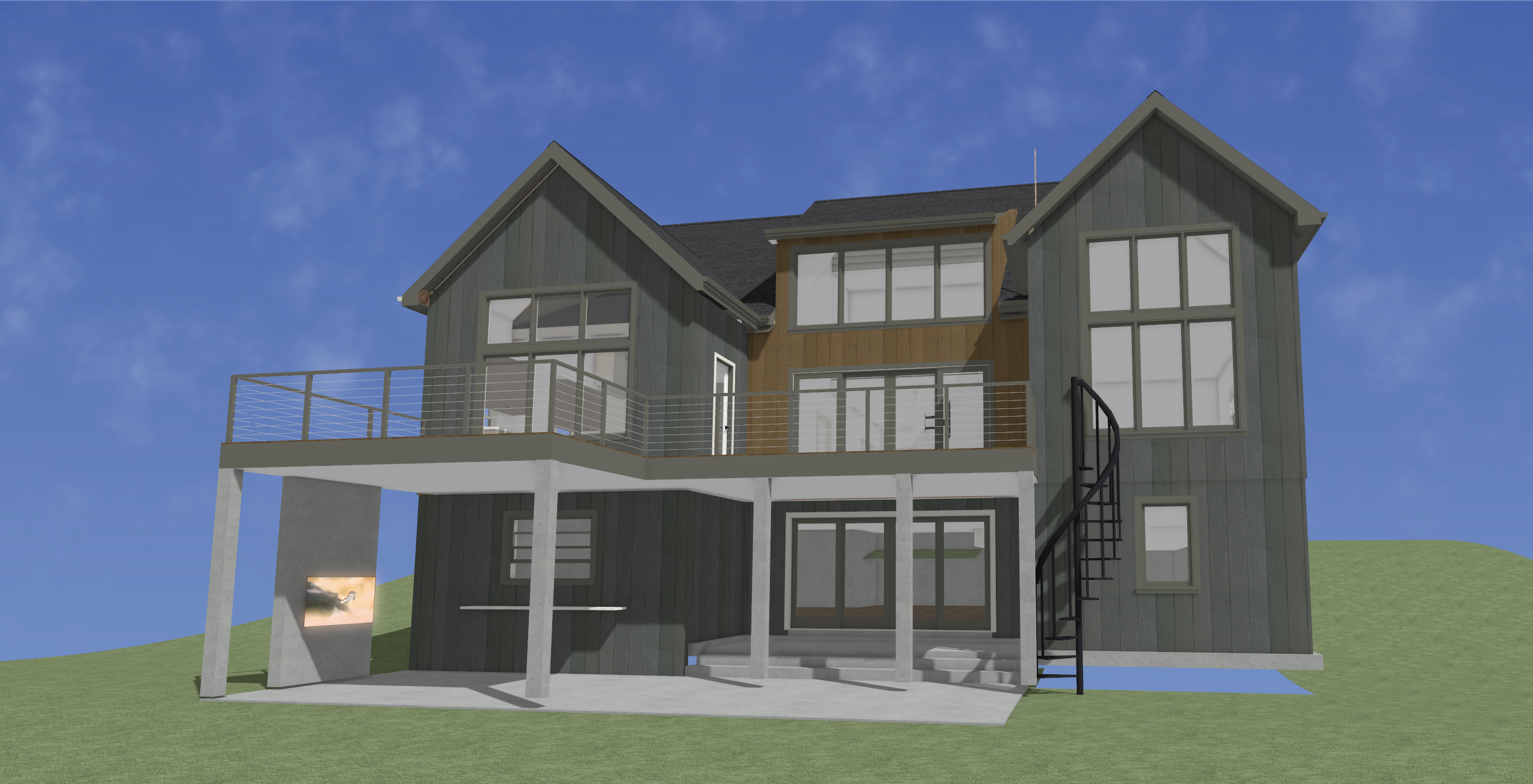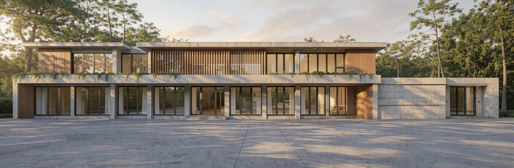 make this be set in the woods make the outdoor area under the deck furnished with modern furniture make the lighting warm golden hour lighting add landscaping along the foundation dont change any struture of the building or color